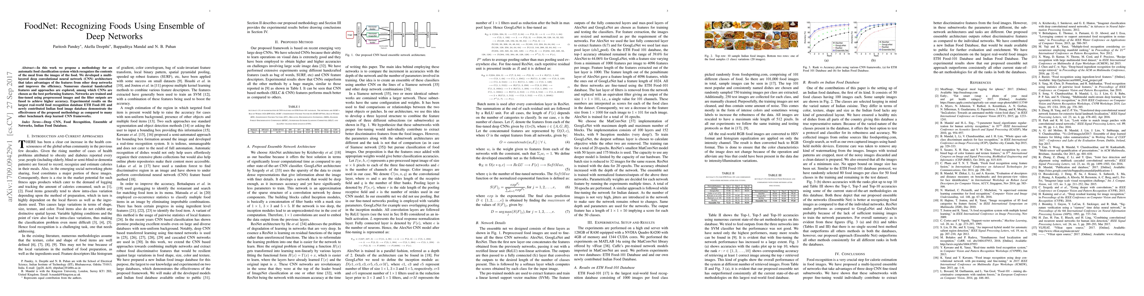 This research introduces an innovative ensemble network architecture that leverages multiple fine-tuned CNNs to extract discriminative features for food image classification, outperforming individual networks and other state-of-the-art methods.