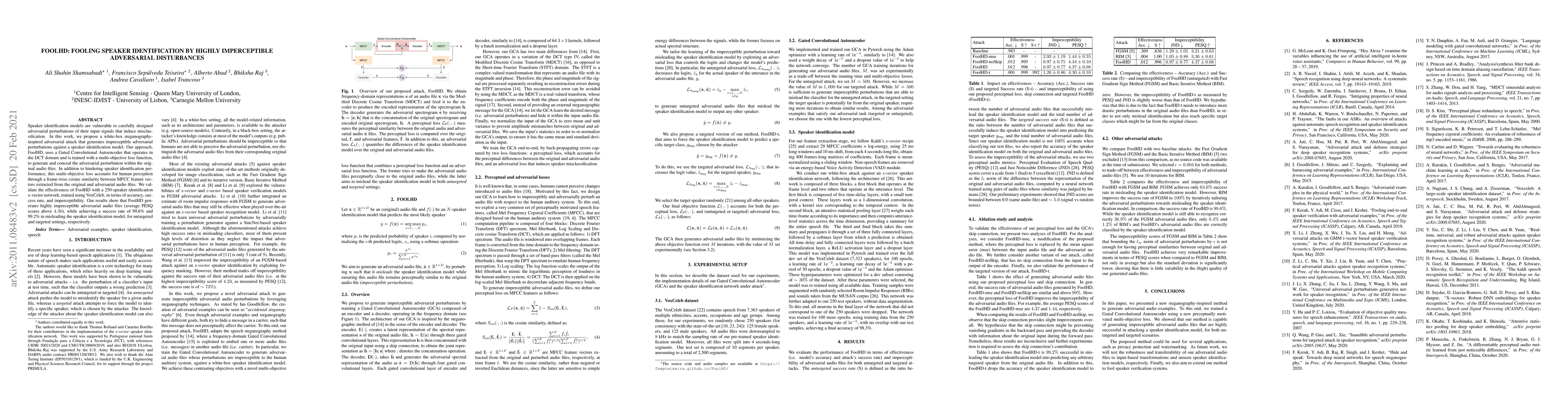 FoolHD proposes a white-box adversarial attack using a Gated Convolutional Autoencoder to generate imperceptible perturbations that mislead speaker identification models. The method achieves a 99.6% success rate in untargeted attacks and 99.2% in targeted attacks while maintaining high audio quality (PESQ scores above 4.30).