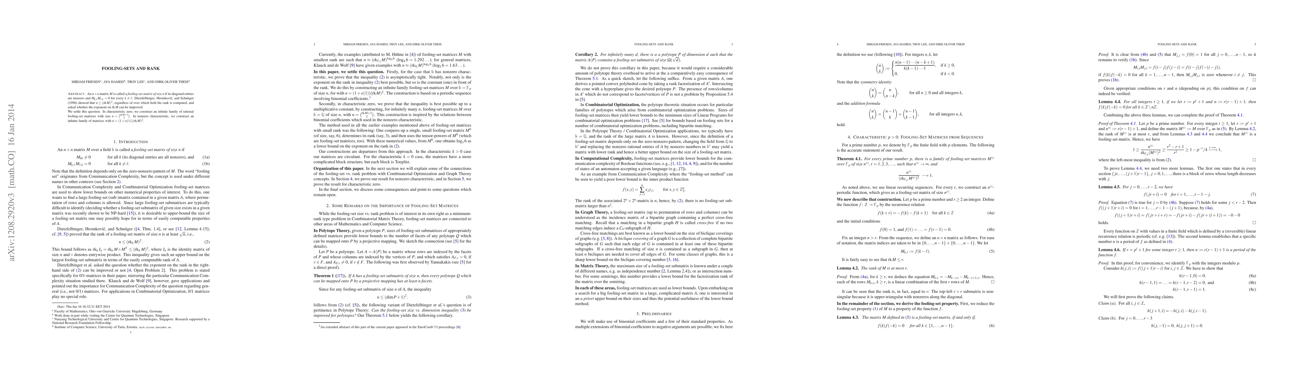 An $n\times n$ matrix $M$ is called a \textit{fooling-set matrix of size $n$} if its diagonal entries are nonzero and $M_{k,\ell} M_{\ell,k} = 0$ for every $k\ne \ell$. Dietzfelbinger, Hromkovi{\v{c}}, and Schnitger (1996) showed that $n \le (\mbox{rk} M)^2$, regardless of over which field the rank is computed, and asked whether the exponent on $\mbox{rk} M$ can be improved. We settle this question. In characteristic zero, we construct an infinite family of rational fooling-set matrices with size $n = \binom{\mbox{rk} M+1}{2}$. In nonzero characteristic, we construct an infinite family of matrices with $n= (1+o(1))(\mbox{rk} M)^2$.