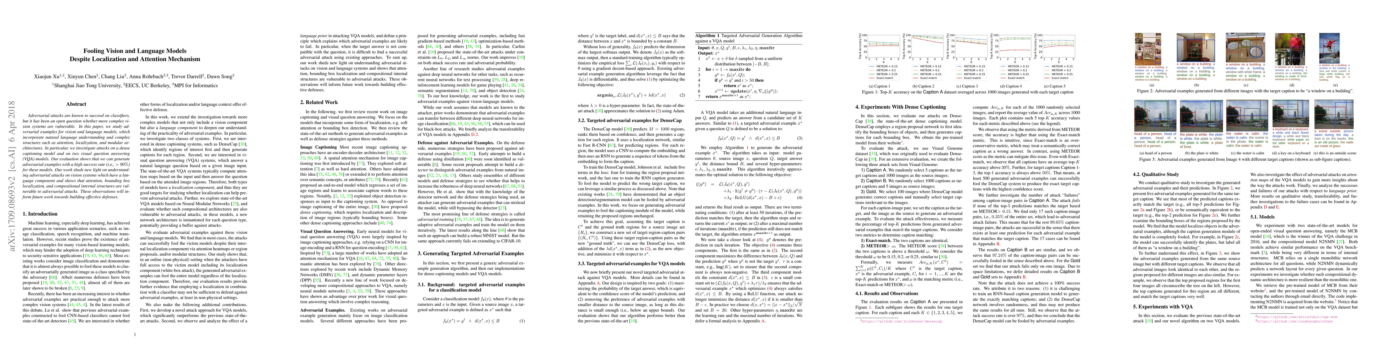 This paper investigates adversarial attacks on complex vision and language models, including dense captioning and visual question answering systems. It demonstrates high success rates (>90%) in generating adversarial examples, indicating vulnerabilities in attention, localization, and modular architectures, thus informing future defense strategies.