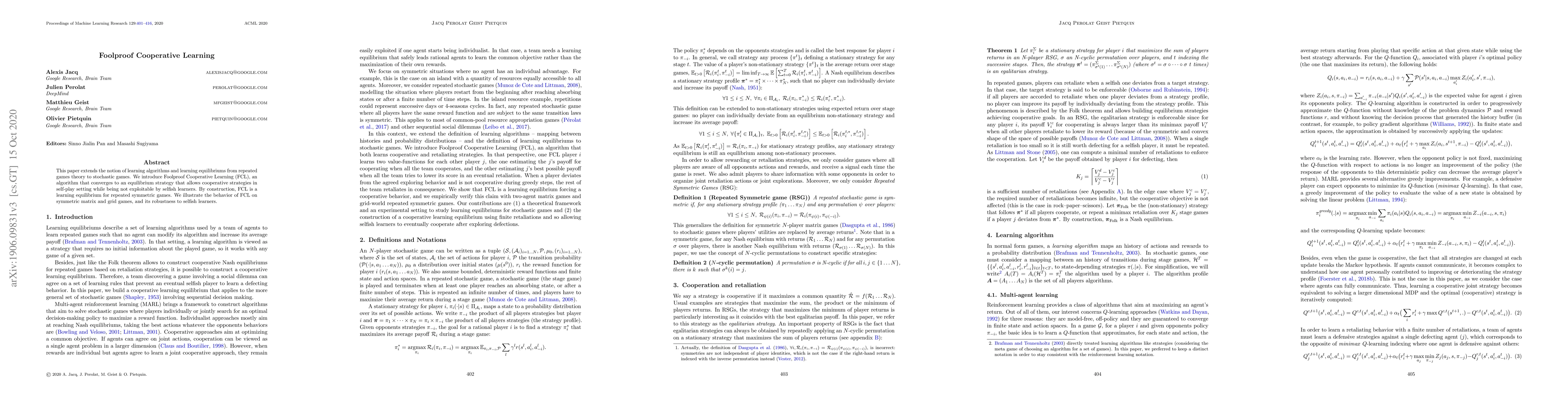 This paper proposes Foolproof Cooperative Learning (FCL), an algorithm that converges to a Tit-for-Tat behavior in stochastic games, ensuring cooperative strategies against itself while remaining unexploitable by selfish players. FCL is proven to be a learning equilibrium in repeated symmetric games.