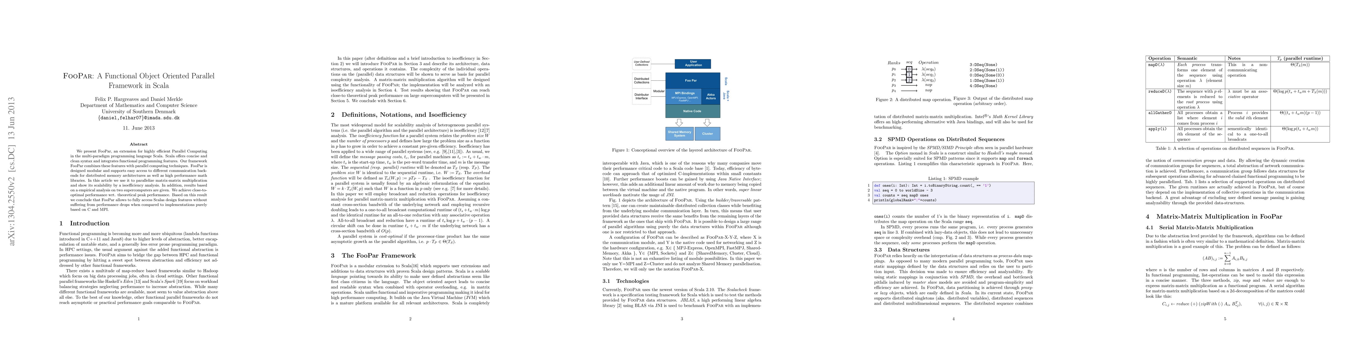 We present FooPar, an extension for highly efficient Parallel Computing in the multi-paradigm programming language Scala. Scala offers concise and clean syntax and integrates functional programming features. Our framework FooPar combines these features with parallel computing techniques. FooPar is designed modular and supports easy access to different communication backends for distributed memory architectures as well as high performance math libraries. In this article we use it to parallelize matrix matrix multiplication and show its scalability by a isoefficiency analysis. In addition, results based on a empirical analysis on two supercomputers are given. We achieve close-to-optimal performance wrt. theoretical peak performance. Based on this result we conclude that FooPar allows to fully access Scala's design features without suffering from performance drops when compared to implementations purely based on C and MPI.