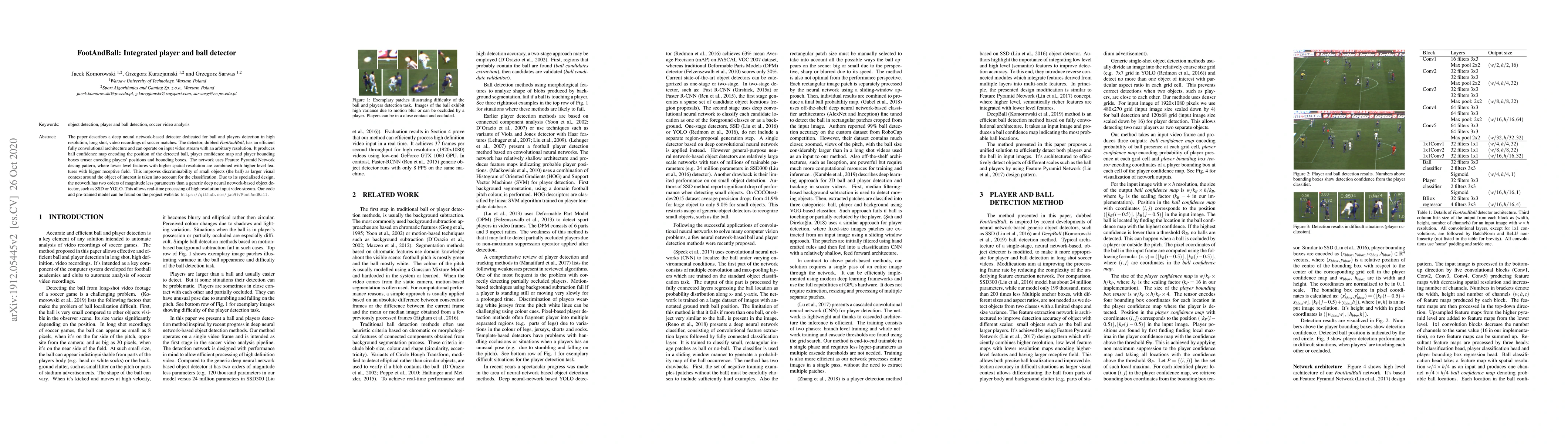 FootAndBall is a specialized deep neural network for detecting soccer balls and players in high-resolution video recordings. It employs a fully convolutional architecture and Feature Pyramid Network for efficient real-time processing.