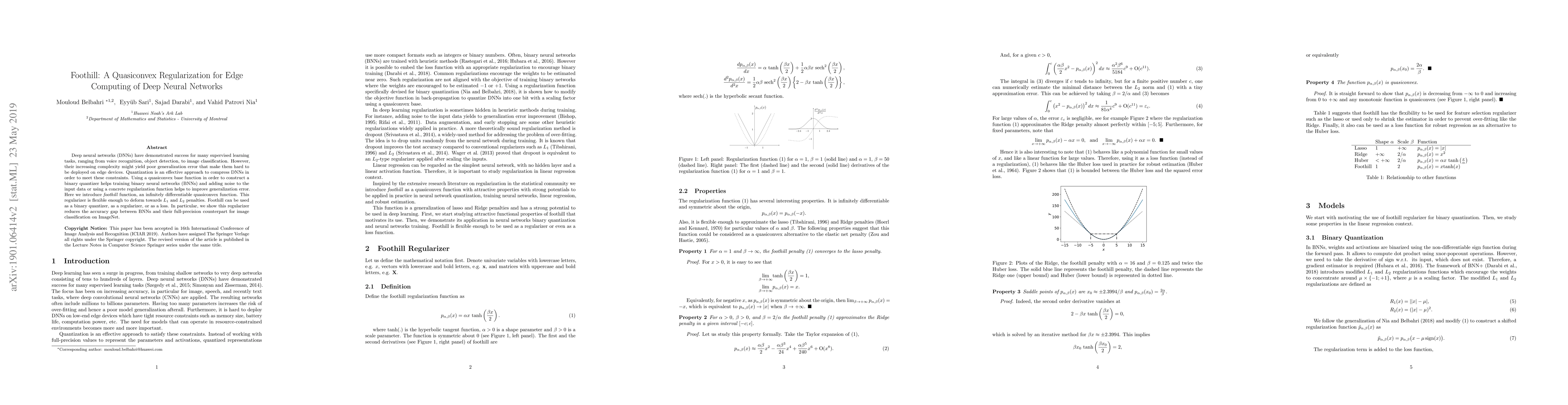 Deep neural networks (DNNs) have demonstrated success for many supervised learning tasks, ranging from voice recognition, object detection, to image classification. However, their increasing complexity might yield poor generalization error that make them hard to be deployed on edge devices. Quantization is an effective approach to compress DNNs in order to meet these constraints. Using a quasiconvex base function in order to construct a binary quantizer helps training binary neural networks (BNNs) and adding noise to the input data or using a concrete regularization function helps to improve generalization error. Here we introduce foothill function, an infinitely differentiable quasiconvex function. This regularizer is flexible enough to deform towards $L_1$ and $L_2$ penalties. Foothill can be used as a binary quantizer, as a regularizer, or as a loss. In particular, we show this regularizer reduces the accuracy gap between BNNs and their full-precision counterpart for image classification on ImageNet.