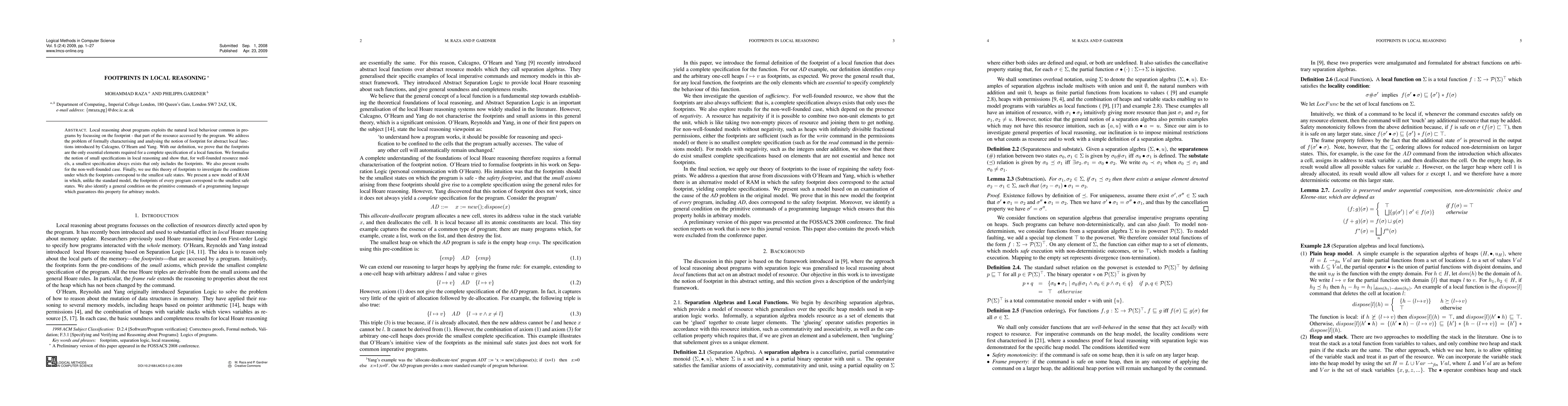 This paper formalises the concept of "footprints" in local reasoning for programs, proving they are the essential elements for specifying local functions. It establishes the existence of smallest specifications that only include footprints, and explores conditions for footprints to correspond to the smallest safe states in a new RAM model.