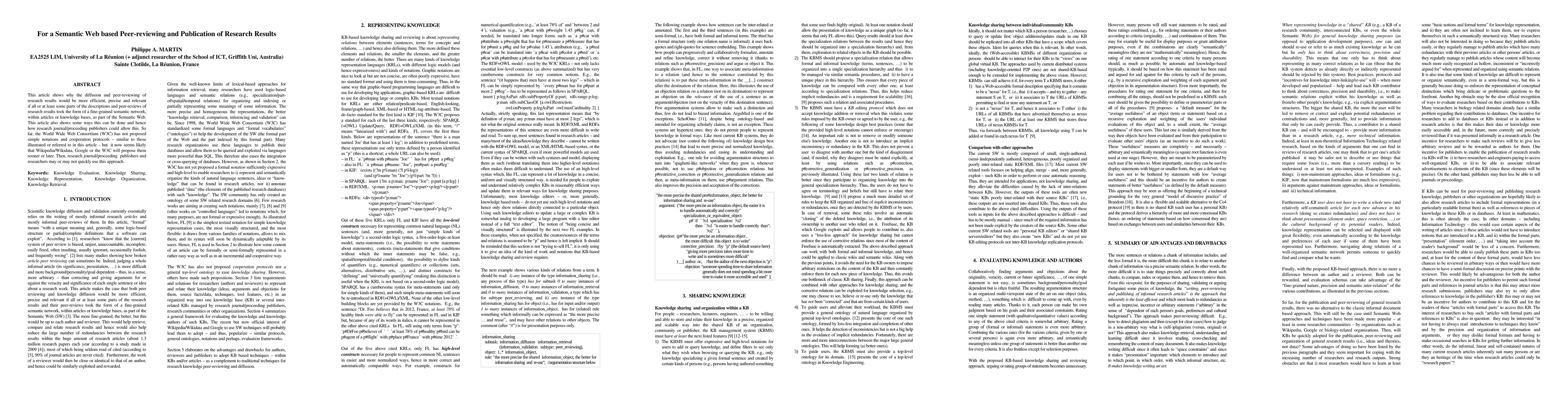This article shows why the diffusion and peer-reviewing of research results would be more efficient, precise and relevant if all or at least some parts of the descriptions and peer-reviews of research results took the form of a fine-grained semantic network, within articles or knowledge bases, as part of the Semantic Web. This article also shows some ways this can be done and hence how research journal/proceeding publishers could allow this. So far, the World Wide Web Consortium (W3C) has not proposed simple notations and cooperation protocols - similar to those illustrated or referred to in this article - but it now seems likely that Wikipedia/Wikidata, Google or the W3C will propose them sooner or later. Then, research journal/proceeding publishers and researchers may or may not quickly use this approach.