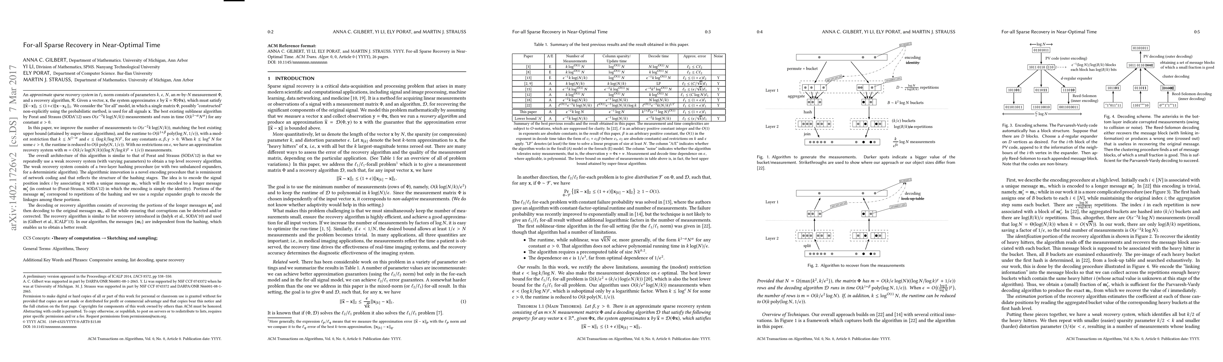 An approximate sparse recovery system in $\ell_1$ norm consists of parameters $k$, $\epsilon$, $N$, an $m$-by-$N$ measurement $\Phi$, and a recovery algorithm, $\mathcal{R}$. Given a vector, $\mathbf{x}$, the system approximates $x$ by $\widehat{\mathbf{x}} = \mathcal{R}(\Phi\mathbf{x})$, which must satisfy $\|\widehat{\mathbf{x}}-\mathbf{x}\|_1 \leq (1+\epsilon)\|\mathbf{x}-\mathbf{x}_k\|_1$. We consider the 'for all' model, in which a single matrix $\Phi$, possibly 'constructed' non-explicitly using the probabilistic method, is used for all signals $\mathbf{x}$. The best existing sublinear algorithm by Porat and Strauss (SODA'12) uses $O(\epsilon^{-3} k\log(N/k))$ measurements and runs in time $O(k^{1-\alpha}N^\alpha)$ for any constant $\alpha > 0$. In this paper, we improve the number of measurements to $O(\epsilon^{-2} k \log(N/k))$, matching the best existing upper bound (attained by super-linear algorithms), and the runtime to $O(k^{1+\beta}\textrm{poly}(\log N,1/\epsilon))$, with a modest restriction that $\epsilon \leq (\log k/\log N)^{\gamma}$, for any constants $\beta,\gamma > 0$. When $k\leq \log^c N$ for some $c>0$, the runtime is reduced to $O(k\textrm{poly}(N,1/\epsilon))$. With no restrictions on $\epsilon$, we have an approximation recovery system with $m = O(k/\epsilon \log(N/k)((\log N/\log k)^\gamma + 1/\epsilon))$ measurements.