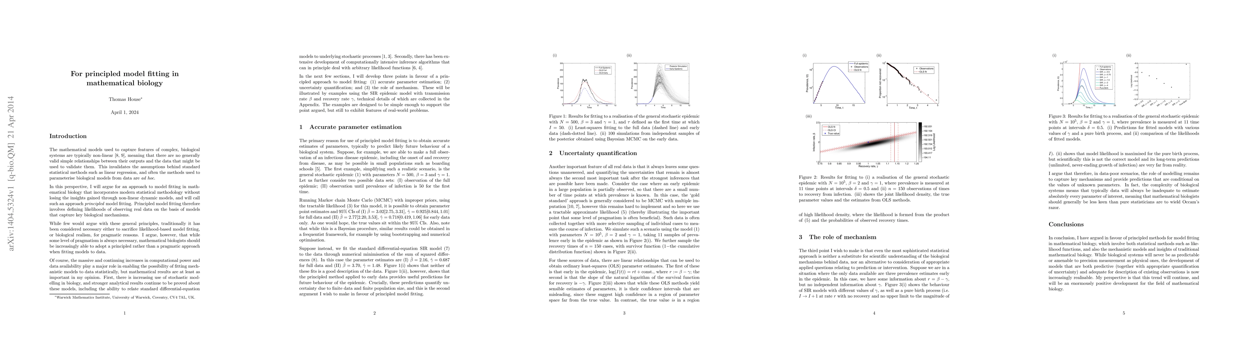 This paper proposes a principled approach to model fitting in mathematical biology, using modern statistical methodology that incorporates key biological mechanisms. It aims to validate models without losing non-linear dynamic insights.