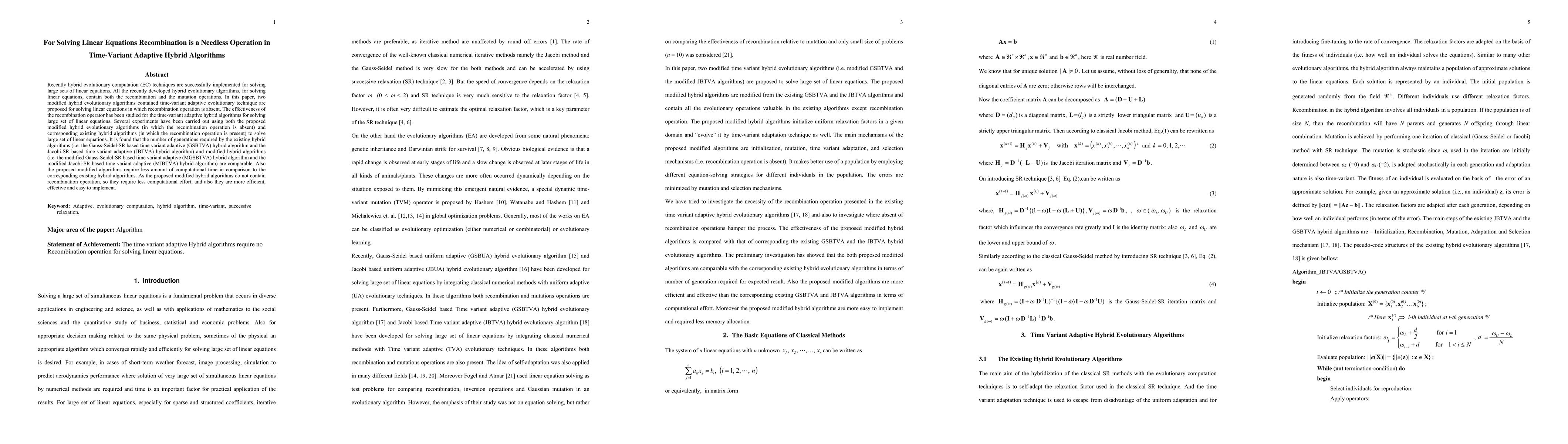 This paper proposes two modified hybrid evolutionary algorithms that exclude the recombination operation for solving large sets of linear equations, demonstrating comparable performance and reduced computational time compared to existing hybrid algorithms that include recombination. The results suggest that recombination is unnecessary in time-variant adaptive hybrid algorithms.