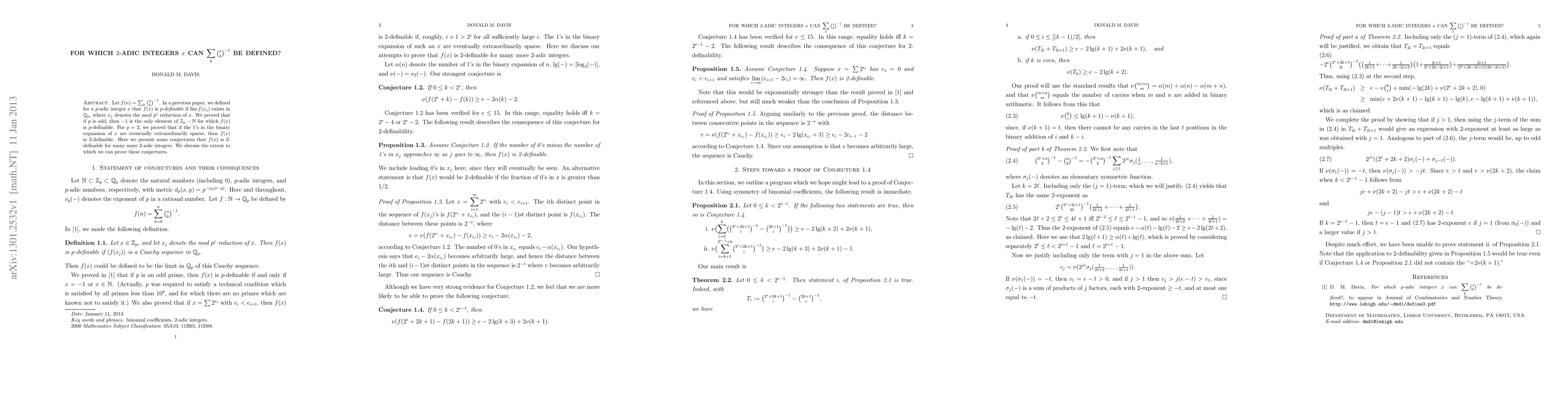 Let $f(n)=\sum_k \binom nk^{-1}$. In a previous paper, we defined for a p-adic integer x that f(x) is p-definable if lim $f(x_j)$ exists in $Q_p$, where $x_j$ denotes the mod $p^j$ reduction of $x$. We proved that if p is odd, then -1 is the only element of $Z_p-N$ for which f(x) is p-definable. For p=2, we proved that if the 1's in the binary expansion of x are eventually extraordinarily sparse, then f(x) is 2-definable. Here we present some conjectures that f(x) is 2-definable for many more 2-adic integers. We discuss the extent to which we can prove these conjectures.