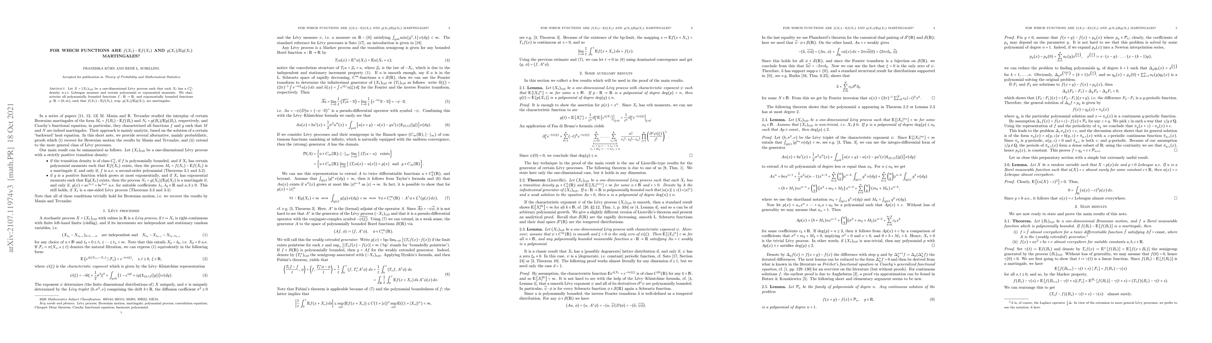 Let $X=(X_t)_{t\geq 0}$ be a one-dimensional L\'evy process such that each $X_t$ has a $C^1_b$-density w.r.t. Lebesgue measure and certain polynomial or exponential moments. We characterize all polynomially bounded functions $f:\mathbb{R}\to\mathbb{R}$, and exponentially bounded functions $g:\mathbb{R}\to (0,\infty)$, such that $f(X_t)-\mathbb{E} f(X_t)$, resp. $g(X_t)/\mathbb{E} g(X_t)$, are martingales.