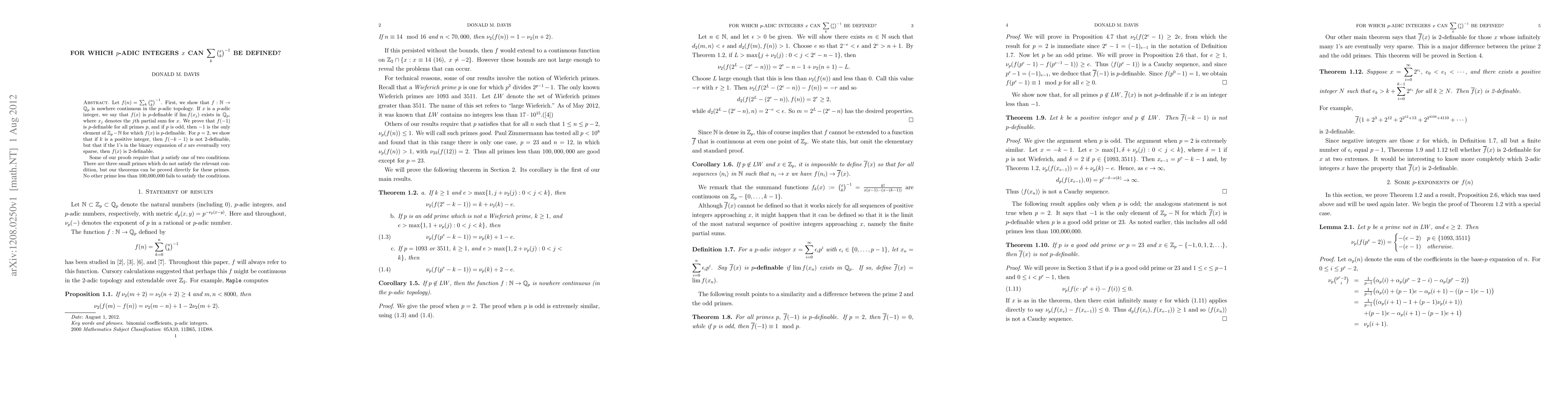 Let f(n)= Sum binomial(n,k)^(-1). First, we show that f:N to Q_p is nowhere continuous in the p-adic topology. If x is a p-adic integer, we say that f(x) is p-definable if lim f(x_j) exists in Q_p, where x_j denotes the jth partial sum for x. We prove that f(-1) is p-definable for all primes p, and if p is odd, then -1 is the only element of Z_p - N for which f(x) is p-definable. For p=2, we show that if k is a positive integer, then f(-k-1) is not 2-definable, but that if the 1's in the binary expansion of x are eventually very sparse, then f(x) is 2-definable. Some of our proofs require that p satisfy one of two conditions. There are three small primes that do not satisfy the relevant condition, but our theorems can be proved directly for these primes. No other prime less than 100,000,000 fails to satisfy the conditions.
