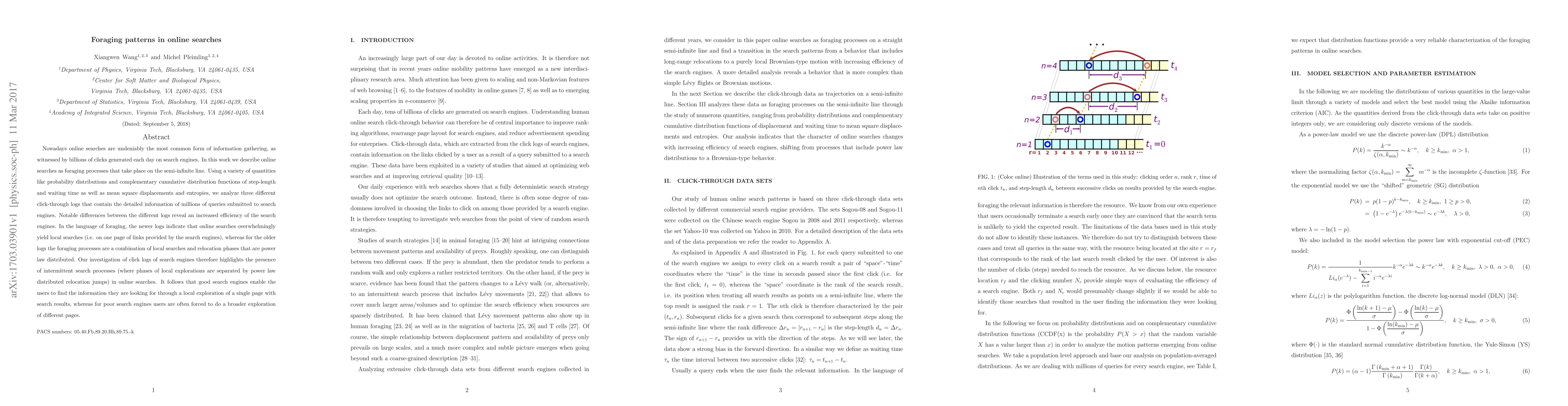 Nowadays online searches are undeniably the most common form of information gathering, as witnessed by billions of clicks generated each day on search engines. In this work we describe online searches as foraging processes that take place on the semi-infinite line. Using a variety of quantities like probability distributions and complementary cumulative distribution functions of step-length and waiting time as well as mean square displacements and entropies, we analyze three different click-through logs that contain the detailed information of millions of queries submitted to search engines. Notable differences between the different logs reveal an increased efficiency of the search engines. In the language of foraging, the newer logs indicate that online searches overwhelmingly yield local searches (i.e. on one page of links provided by the search engines), whereas for the older logs the foraging processes are a combination of local searches and relocation phases that are power law distributed. Our investigation of click logs of search engines therefore highlights the presence of intermittent search processes (where phases of local explorations are separated by power law distributed relocation jumps) in online searches. It follows that good search engines enable the users to find the information they are looking for through a local exploration of a single page with search results, whereas for poor search engines users are often forced to do a broader exploration of different pages.