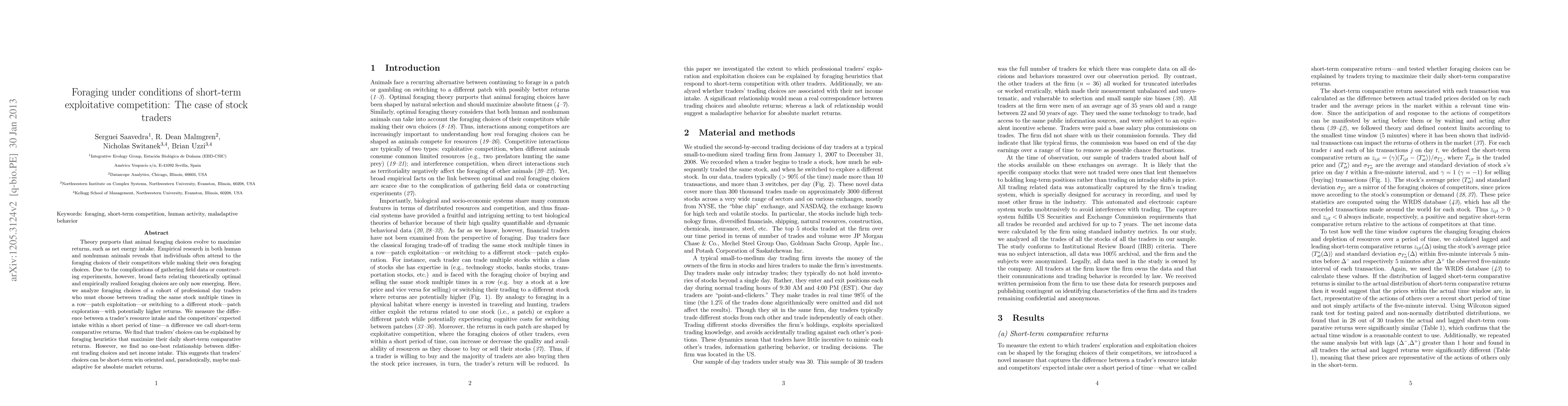 This study examines the foraging strategies of professional day traders under short-term exploitative competition, finding that traders' choices maximize their short-term comparative returns rather than overall net income, indicating a potential maladaptation for long-term market success.