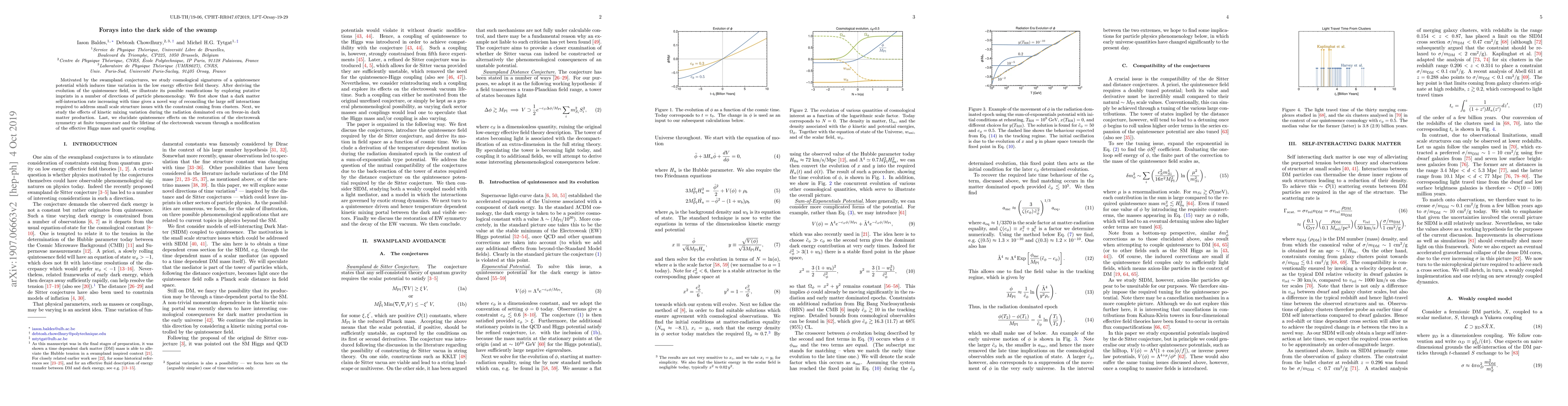 Motivated by the swampland conjectures, we study cosmological signatures of a quintessence potential which induces time variation in the low energy effective field theory. After deriving the evolution of the quintessence field, we illustrate its possible ramifications by exploring putative imprints in a number of directions of particle phenomenology. We first show that a dark matter self-interaction rate increasing with time gives a novel way of reconciling the large self interactions required to address small scale structure issues with the constraint coming from clusters. Next, we study the effects of kinetic mixing variation during the radiation dominated era on freeze-in dark matter production. Last, we elucidate quintessence effects on the restoration of the electroweak symmetry at finite temperature and the lifetime of the electroweak vacuum through a modification of the effective Higgs mass and quartic coupling.