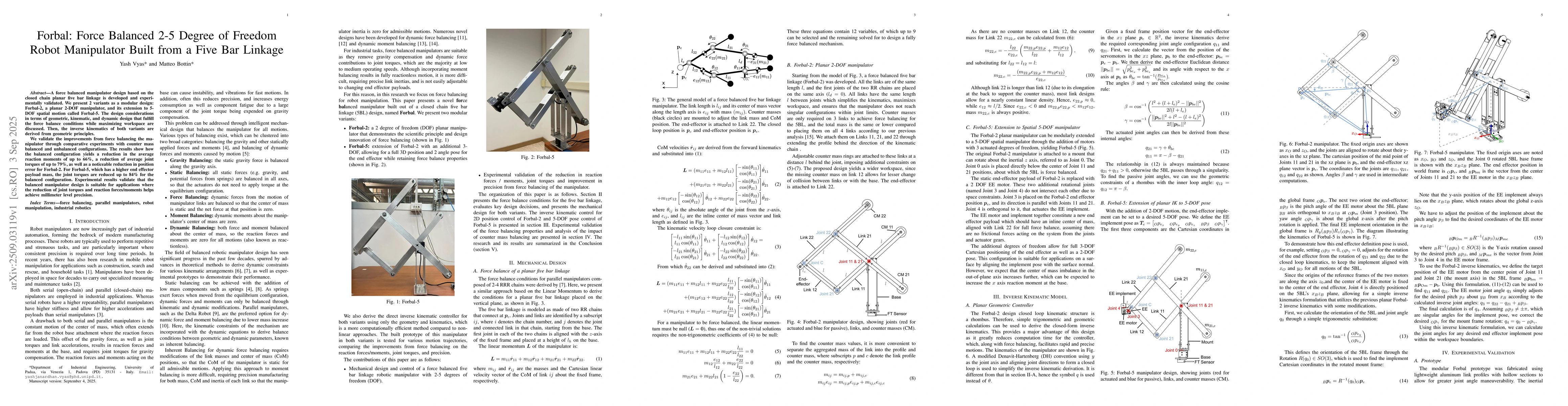 A force balanced manipulator design based on the closed chain planar five bar linkage is developed and experimentally validated. We present 2 variants as a modular design: Forbal-2, a planar 2-DOF manipulator, and its extension to 5-DOF spatial motion called Forbal-5. The design considerations in terms of geometric, kinematic, and dynamic design that fulfill the force balance conditions while maximizing workspace are discussed. Then, the inverse kinematics of both variants are derived from geometric principles. We validate the improvements from force balancing the manipulator through comparative experiments with counter mass balanced and unbalanced configurations. The results show how the balanced configuration yields a reduction in the average reaction moments of up to 66\%, a reduction of average joint torques of up to 79\%, as well as a noticeable reduction in position error for Forbal-2. For Forbal-5, which has a higher end effector payload mass, the joint torques are reduced up to 84\% for the balanced configuration. Experimental results validate that the balanced manipulator design is suitable for applications where the reduction of joint torques and reaction forces/moments helps achieve millimeter level precision.