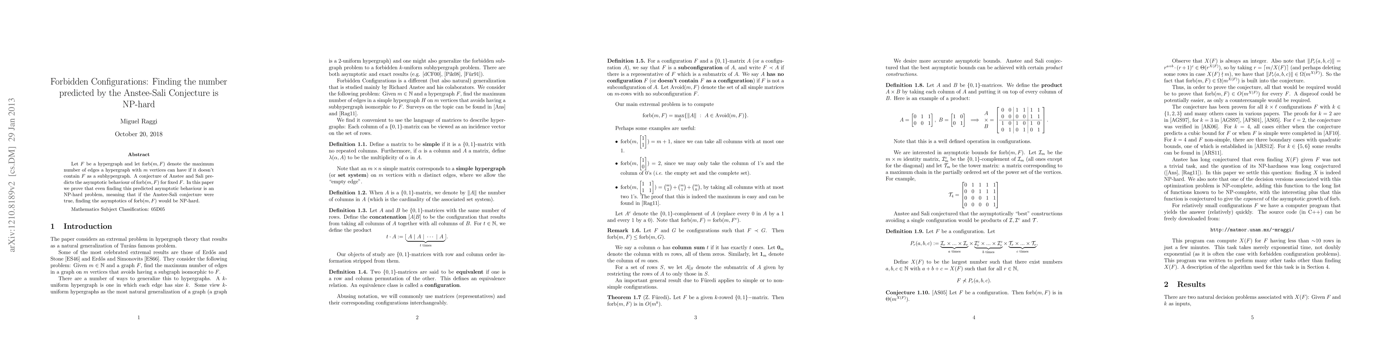 This paper proves that determining the asymptotic behavior of forb(m,F), which represents the maximum number of edges in a hypergraph without a specific subhypergraph F, is NP-hard, indicating that verifying the Anstee-Sali conjecture would be computationally intractable.