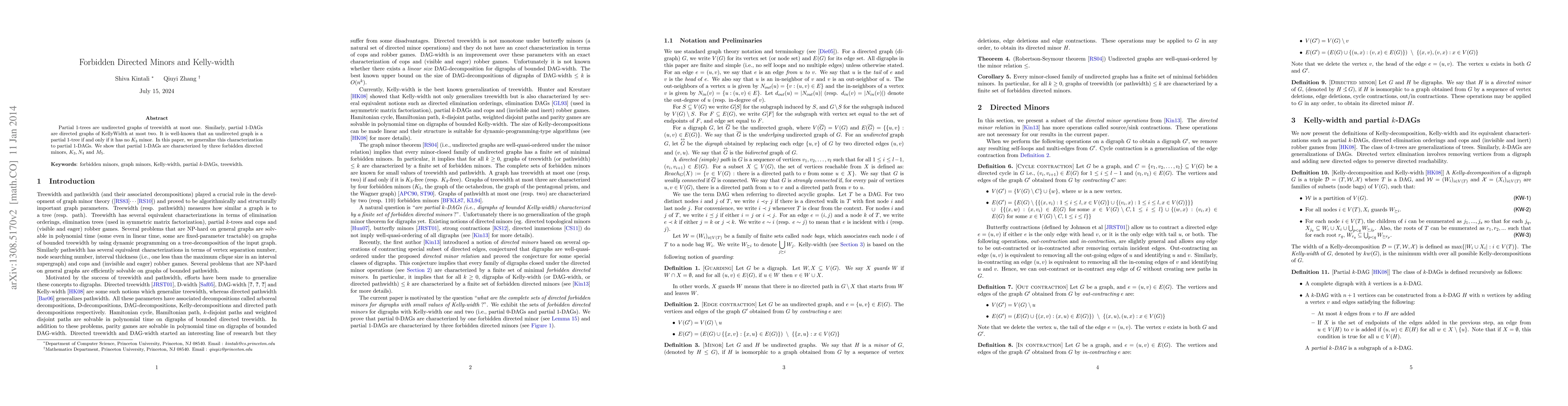 This paper characterizes partial 1-DAGs, directed graphs with Kelly-width at most two, by identifying three forbidden directed minors: K_3, N_4, and M_5. This extends the analogous characterization of undirected partial 1-trees, which are defined by the absence of K_3 as a minor.