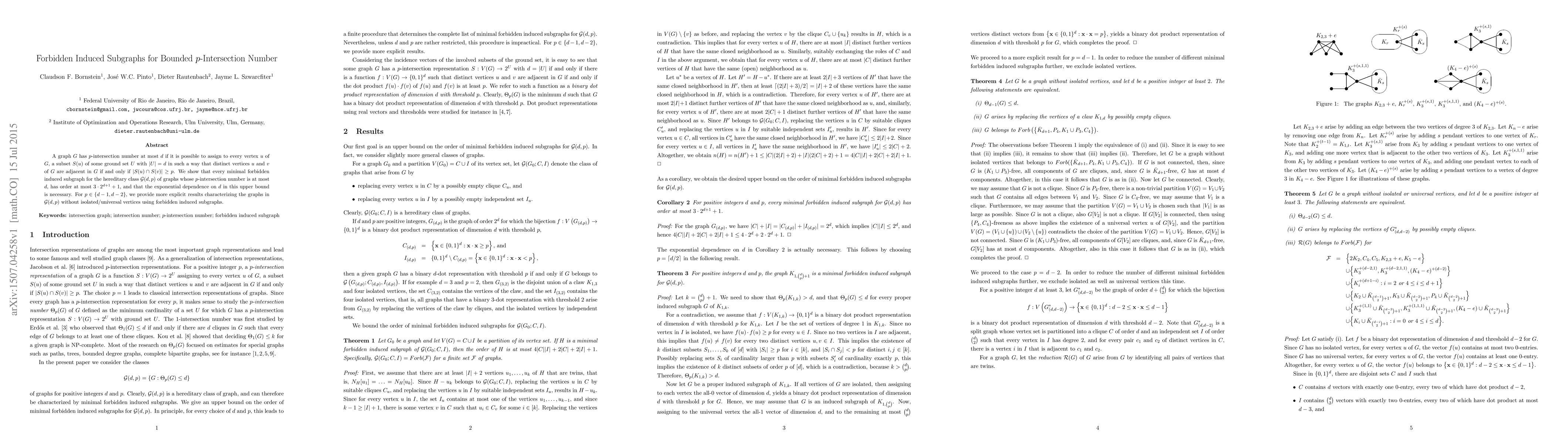 This paper investigates the $p$-intersection number of graphs, demonstrating that minimal forbidden induced subgraphs for the hereditary class ${\cal G}(d,p)$ have an upper bound on order, showing that the exponential dependence on $d$ is essential. For specific values of $p$, it provides explicit characterizations using forbidden subgraphs.