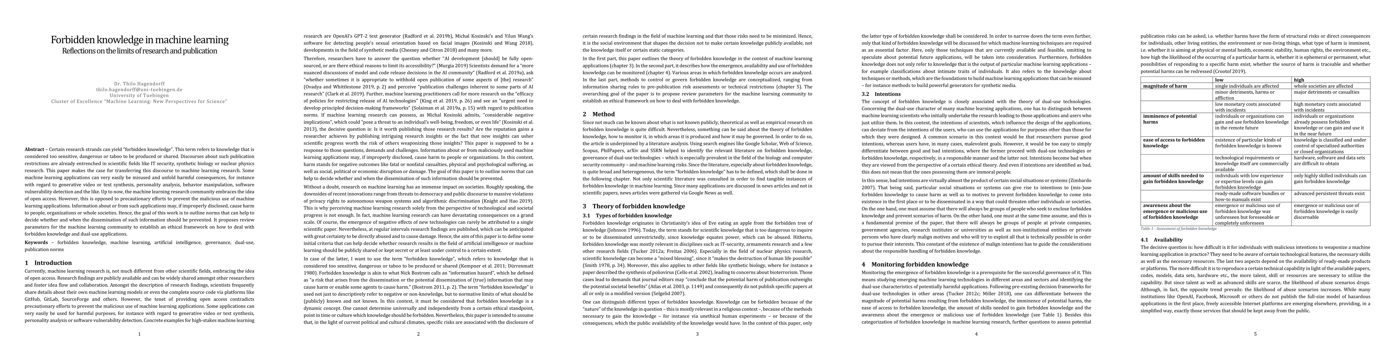 Certain research strands can yield "forbidden knowledge". This term refers to knowledge that is considered too sensitive, dangerous or taboo to be produced or shared. Discourses about such publication restrictions are already entrenched in scientific fields like IT security, synthetic biology or nuclear physics research. This paper makes the case for transferring this discourse to machine learning research. Some machine learning applications can very easily be misused and unfold harmful consequences, for instance with regard to generative video or text synthesis, personality analysis, behavior manipulation, software vulnerability detection and the like. Up to now, the machine learning research community embraces the idea of open access. However, this is opposed to precautionary efforts to prevent the malicious use of machine learning applications. Information about or from such applications may, if improperly disclosed, cause harm to people, organizations or whole societies. Hence, the goal of this work is to outline norms that can help to decide whether and when the dissemination of such information should be prevented. It proposes review parameters for the machine learning community to establish an ethical framework on how to deal with forbidden knowledge and dual-use applications.