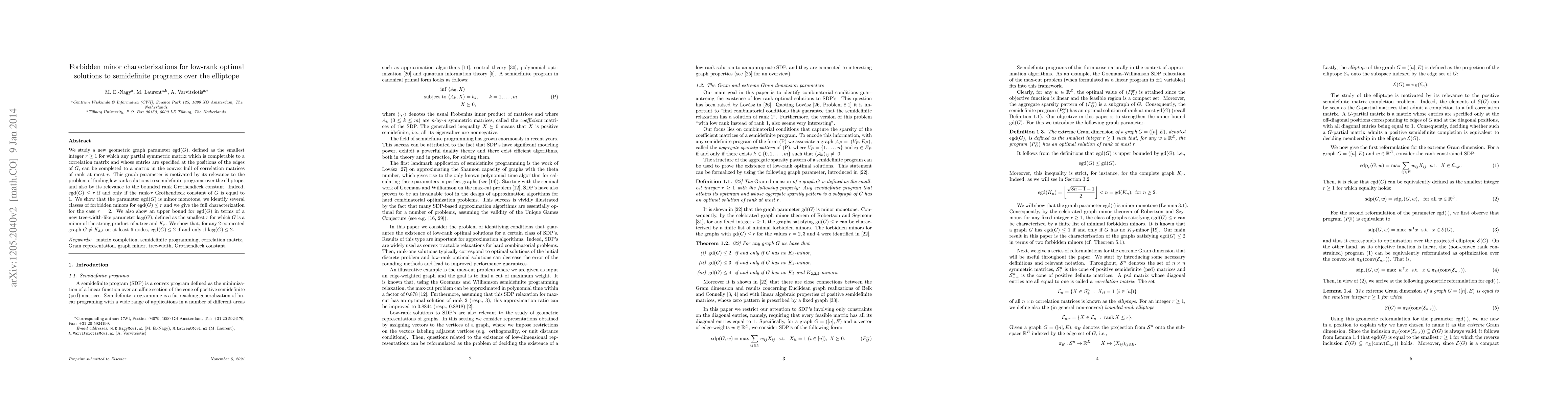 We study a new geometric graph parameter $\egd(G)$, defined as the smallest integer $r\ge 1$ for which any partial symmetric matrix which is completable to a correlation matrix and whose entries are specified at the positions of the edges of $G$, can be completed to a matrix in the convex hull of correlation matrices of $\rank $ at most $r$. This graph parameter is motivated by its relevance to the problem of finding low rank solutions to semidefinite programs over the elliptope, and also by its relevance to the bounded rank Grothendieck constant. Indeed, $\egd(G)\le r$ if and only if the rank-$r$ Grothendieck constant of $G$ is equal to 1. We show that the parameter $\egd(G)$ is minor monotone, we identify several classes of forbidden minors for $\egd(G)\le r$ and we give the full characterization for the case $r=2$. We also show an upper bound for $\egd(G)$ in terms of a new tree-width-like parameter $\sla(G)$, defined as the smallest $r$ for which $G$ is a minor of the strong product of a tree and $K_r$. We show that, for any 2-connected graph $G\ne K_{3,3}$ on at least 6 nodes, $\egd(G)\le 2$ if and only if $\sla(G)\le 2$.
