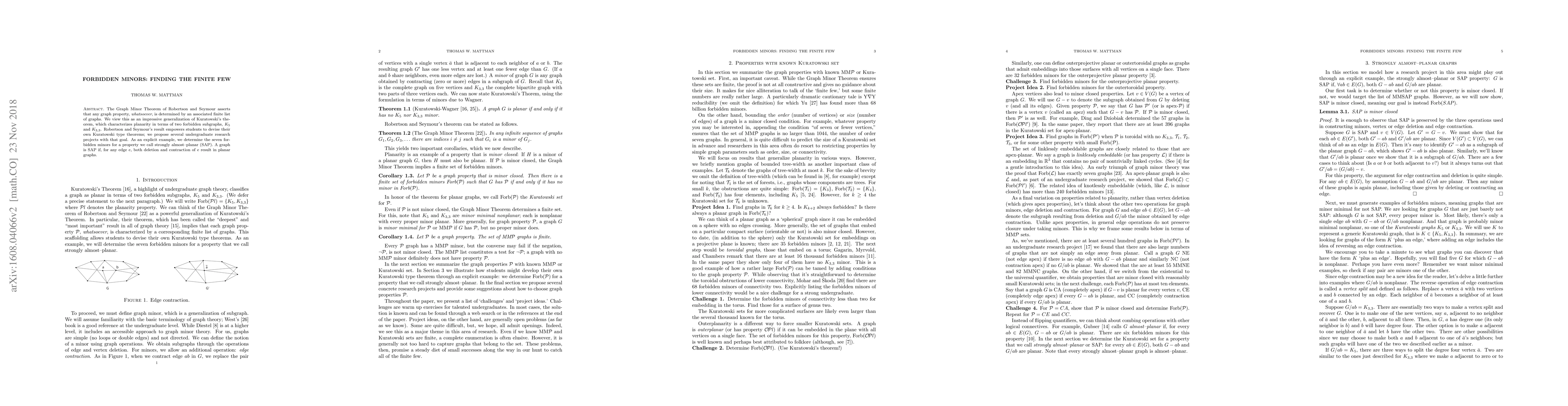 This paper explores the Graph Minor Theorem by Robertson and Seymour, which generalizes Kuratowski's theorem on planarity. It identifies seven forbidden minors for the "strongly almost-planar" property, where deleting or contracting any edge results in a planar graph, and proposes undergraduate research projects based on this theorem.