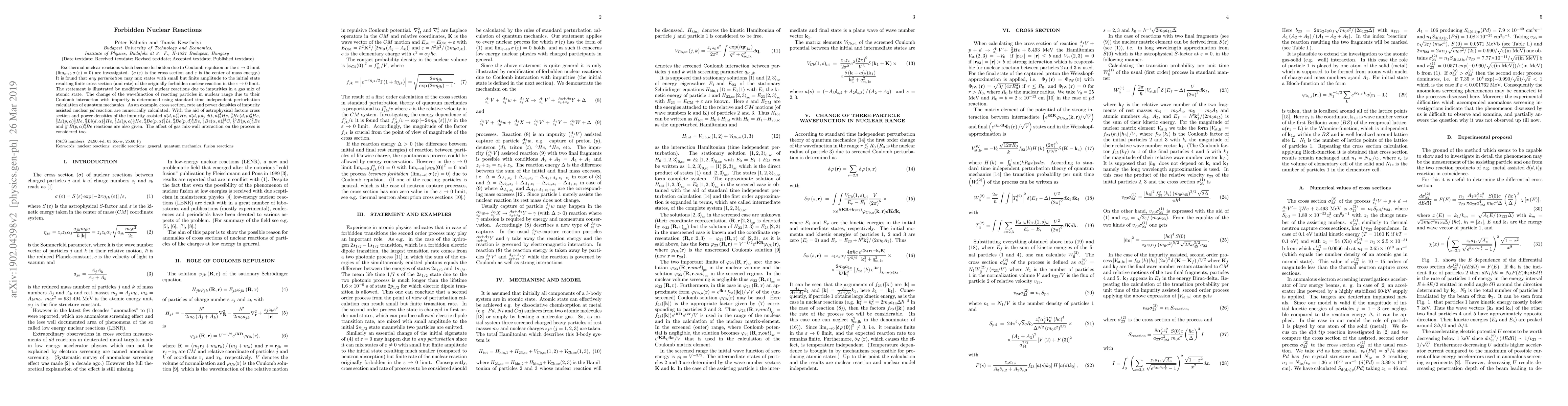 Exothermal nuclear reactions which become forbidden due to Coulomb repulsion in the\ $\varepsilon \rightarrow 0$ limit ($\lim_{\varepsilon \rightarrow 0}\sigma \left( \varepsilon \right) =0$) are investigated. ($\sigma \left( \varepsilon \right) $ is the cross section and $\varepsilon $ is the center of mass energy.) It is found that any perturbation may mix states with small but finite amplitude to the initial state resulting finite cross section (and rate) of the originally forbidden nuclear reaction in the $% \varepsilon \rightarrow 0$ limit. The statement is illustrated by modification of nuclear reactions due to impurities in a gas mix of atomic state. The change of the wavefunction of reacting particles in nuclear range due to their Coulomb interaction with impurity is determined using standard time independent perturbation calculation of quantum mechanics. As an example, cross section, rate and power densities of impurity assisted nuclear $pd$ reaction are numerically calculated. With the aid of astrophysical factors cross section and power densities of the impurity assisted $d(d,n)_{2}^{3}He$, $d(d,p)t$, $d(t,n)_{2}^{4}He$, $% _{2}^{3}He(d,p)_{2}^{4}He$, $_{3}^{6}Li(p,\alpha )_{2}^{3}He$, $% _{3}^{6}Li(d,\alpha )_{2}^{4}He$, $_{3}^{7}Li(p,\alpha )_{2}^{4}He$, $% _{4}^{9}Be(p,\alpha )_{3}^{6}Li$, $_{4}^{9}Be(p,d)_{4}^{8}Be$, $% _{4}^{9}Be(\alpha ,n)_{6}^{12}C$, $_{5}^{10}B(p,\alpha )_{4}^{7}Be$ and $% _{5}^{11}B(p,\alpha )_{4}^{8}Be$ reactions are also given. The affect of gas mix-wall interaction on the process is considered too.