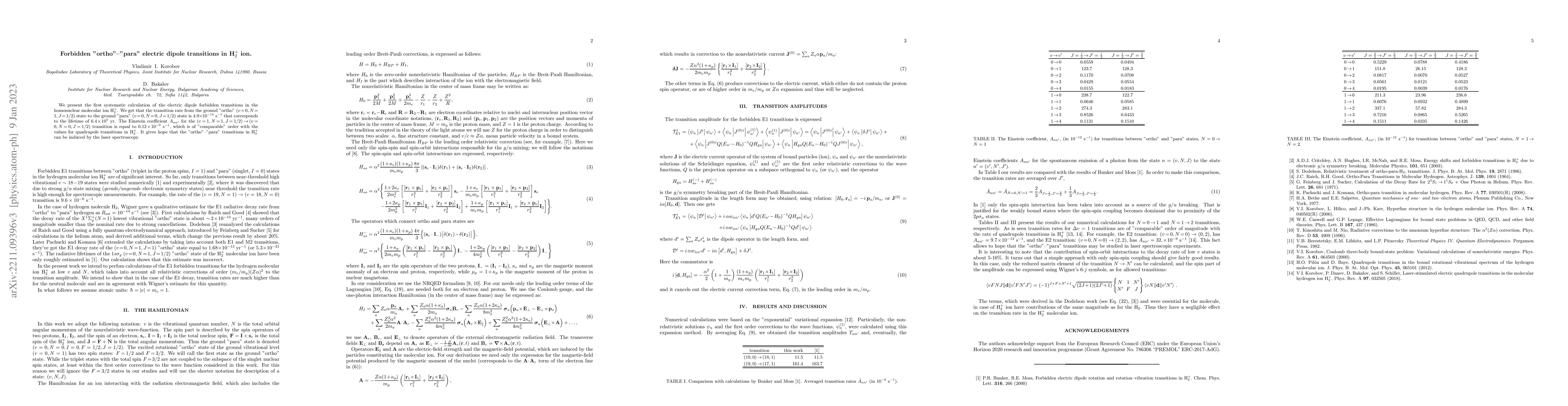 This paper systematically calculates the electric dipole forbidden transitions in H$_2^+$, finding a transition rate of $4.9\!\times\!10^{-14}$ s$^{-1}$ between "ortho" and "para" states, suggesting a potential for laser spectroscopy to induce these transitions.