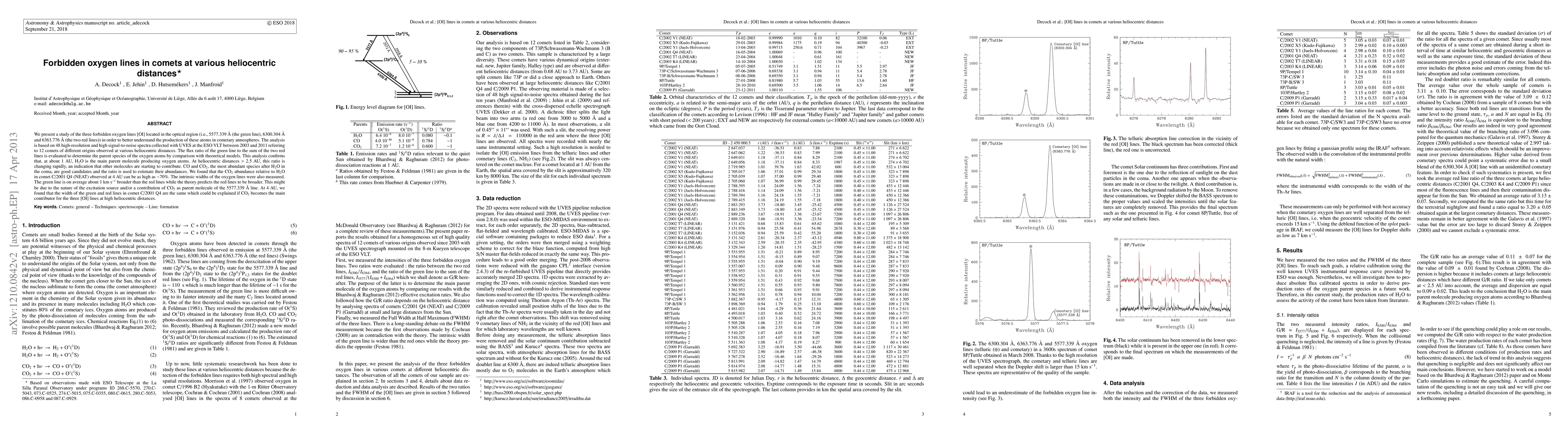 This study examines forbidden oxygen lines in comets using 48 high-resolution spectra from 2003-2011, identifying H2O as the primary oxygen source near 1 AU. Beyond 2.5 AU, CO and CO2 contributions are noted, with CO2 making up to 70% of oxygen-source molecules in Comet C/2001 Q4 at 4 AU. The analysis also reveals the green line's broader width than the red lines, possibly due to CO2's excitation role, and equal line widths at high heliocentric distances, suggesting CO2 dominance.