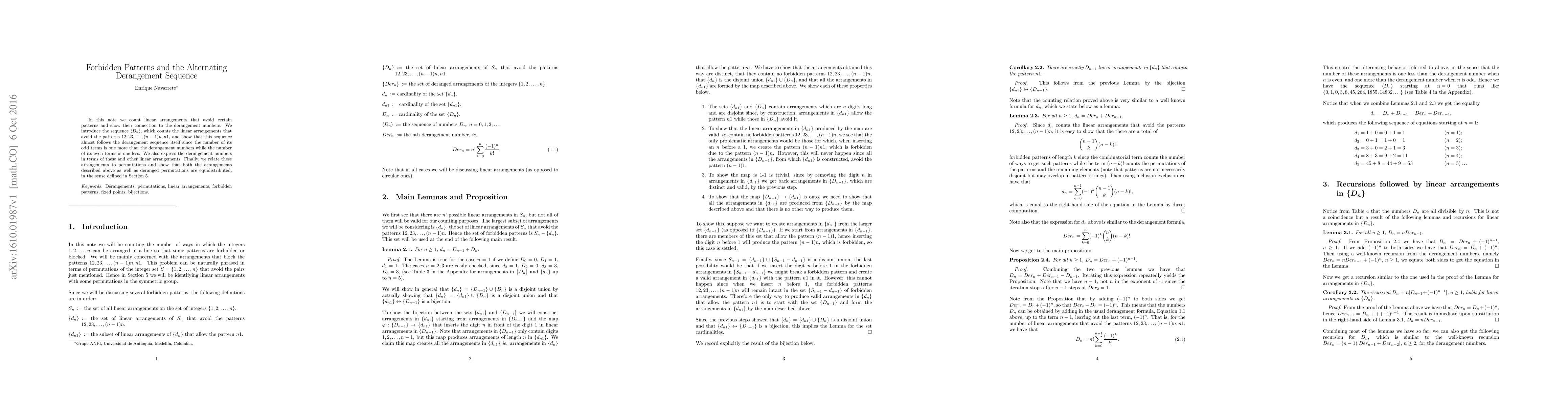 This paper studies linear arrangements that avoid certain patterns, connecting them to derangement numbers. It finds a sequence almost following the derangement sequence, with odd terms being one more than derangement numbers and even terms being one less.