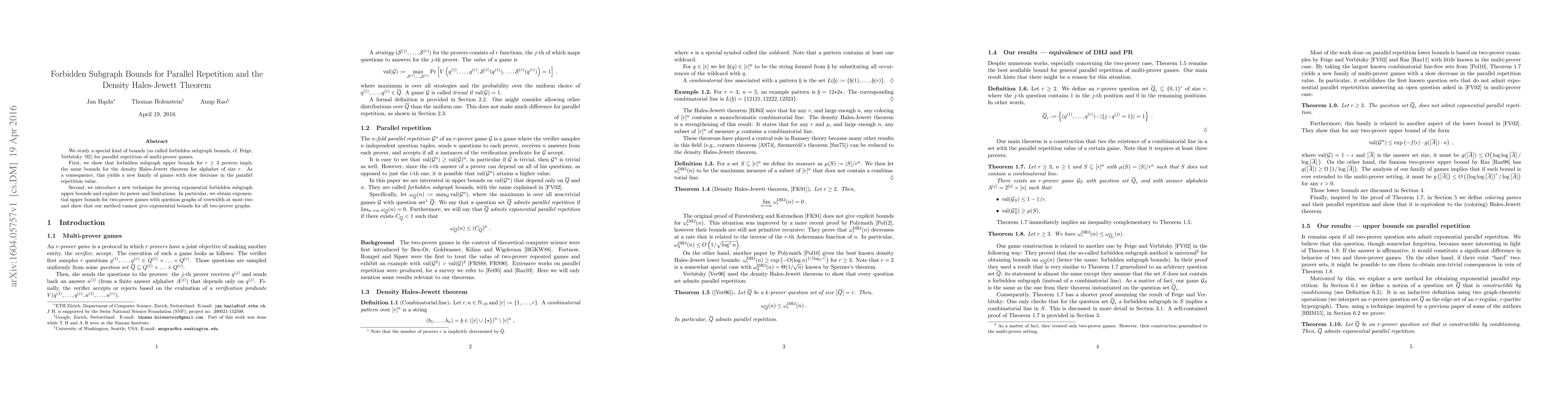 This paper investigates forbidden subgraph bounds for parallel repetition of multi-prover games, demonstrating their implications for the density Hales-Jewett theorem. It also introduces a new technique for proving exponential bounds, showing its effectiveness for specific two-prover games but limitations for all two-prover graphs.