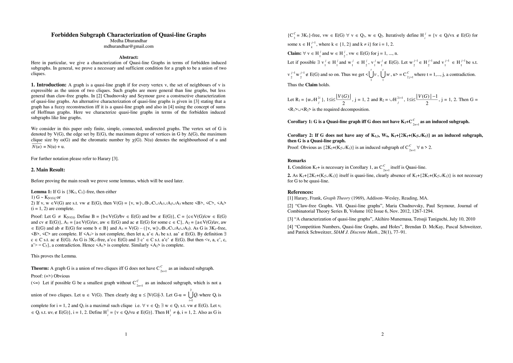 This paper characterizes Quasi-line Graphs using forbidden induced subgraphs and establishes a necessary and sufficient condition for a graph to be a union of two cliques.
