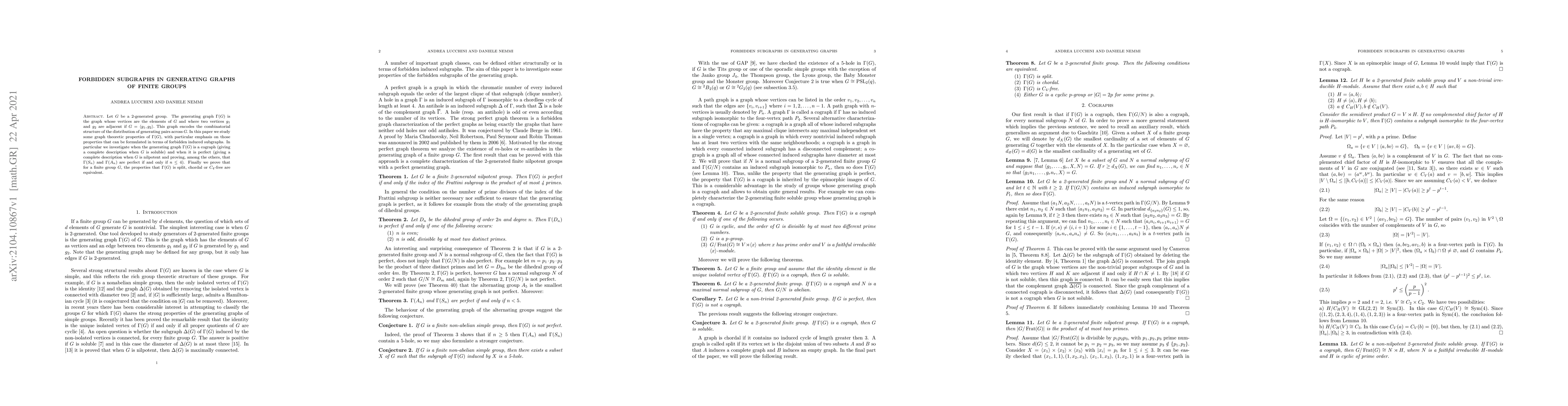 This paper studies properties of generating graphs of finite groups, focusing on forbidden induced subgraphs to describe their structure, with key findings including perfect graphs for soluble groups and equivalence of certain properties for nilpotent groups.
