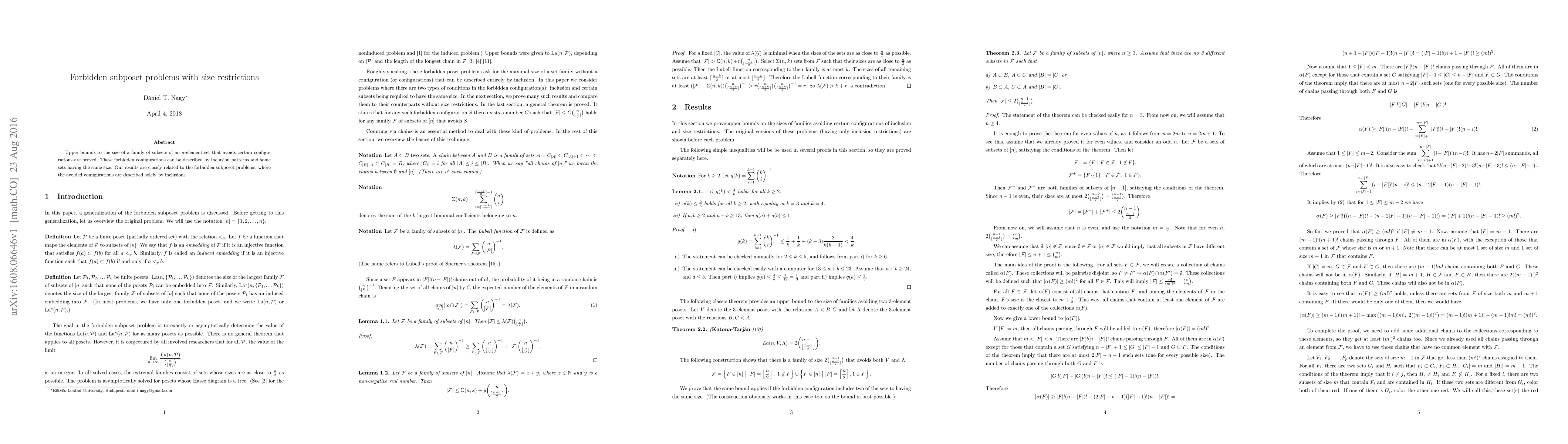 This paper establishes upper bounds on the size of subset families from an n-element set that avoid specific inclusion patterns and size restrictions. The findings are connected to forbidden subposet problems, which focus on configurations defined by inclusions alone.