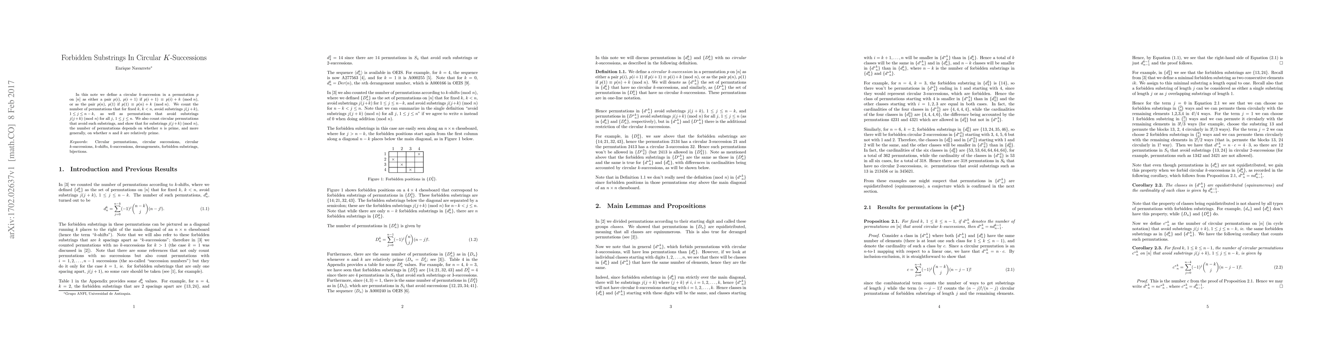 This paper defines circular k-successions in permutations and counts permutations that avoid specific substrings j(j+k) and j(j+k) (mod n). It reveals that the number of such permutations depends on the primality of n and the relative primality of n and k.