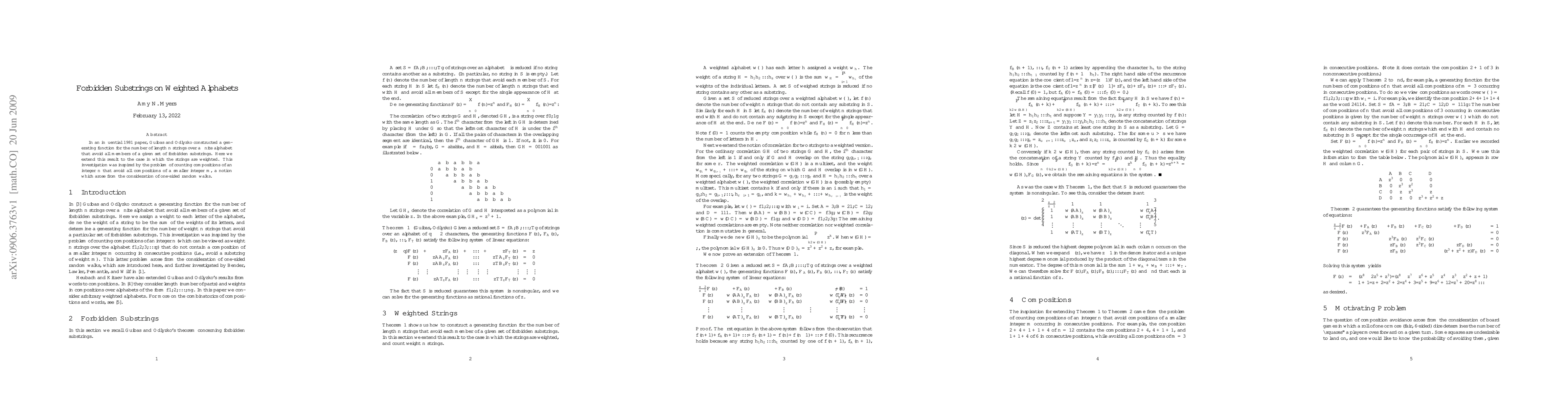 This paper extends the generating function for counting length n strings over a weighted alphabet that avoid specific forbidden substrings, inspired by the problem of counting integer compositions avoiding smaller compositions, relevant to one-sided random walks.