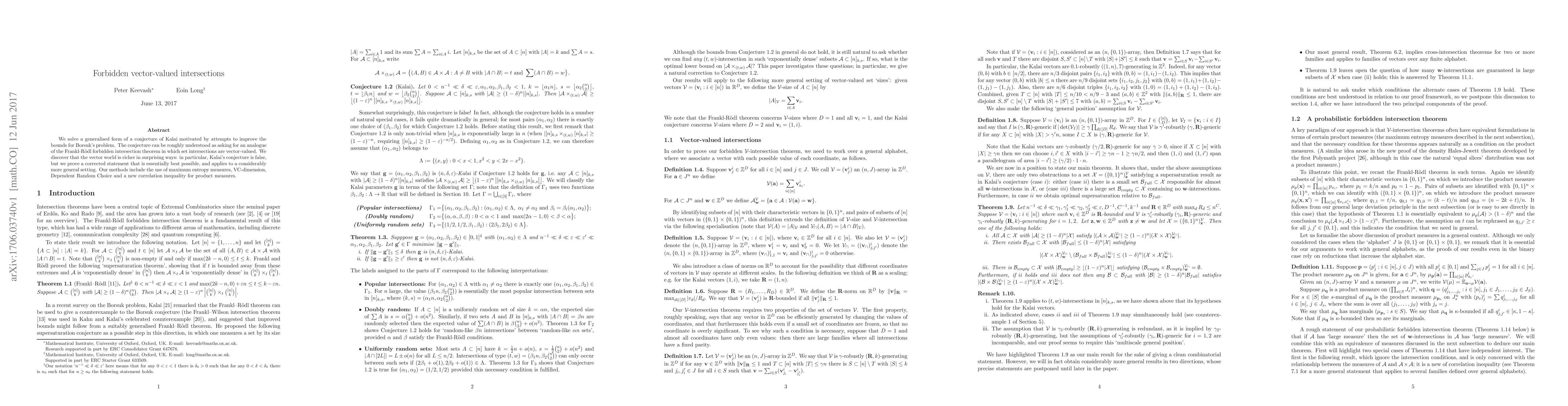 Researchers disprove Kalai's conjecture on vector-valued intersections, but prove a corrected statement that offers the best possible bound for a related problem. They achieve this using advanced mathematical techniques such as maximum entropy measures and correlation inequalities.