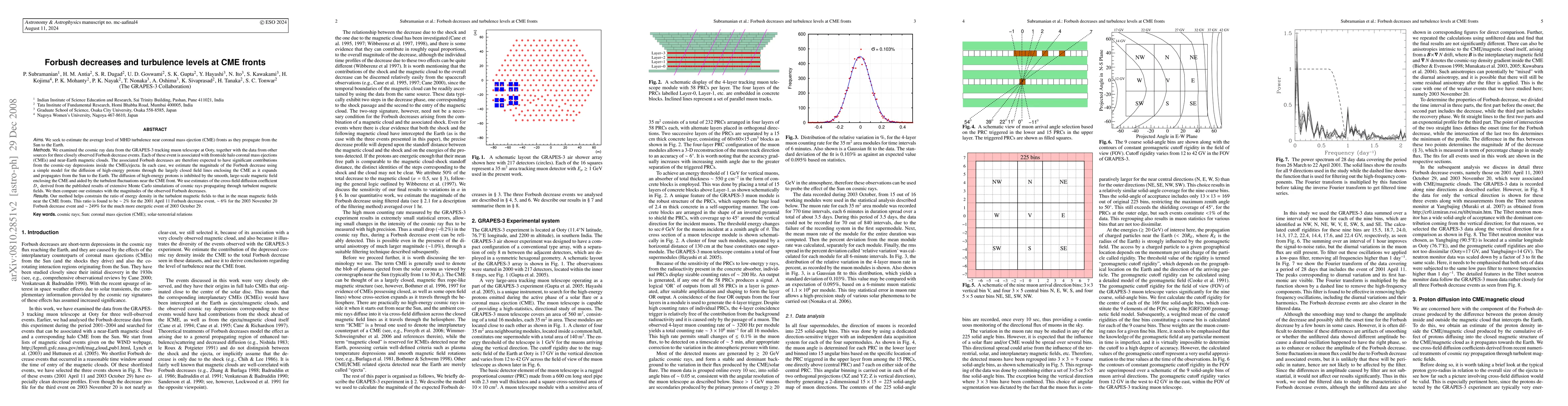 We seek to estimate the average level of MHD turbulence near coronal mass ejection (CME) fronts as they propagate from the Sun to the Earth. We examine the cosmic ray data from the GRAPES-3 tracking muon telescope at Ooty, together with the data from other sources for three well observed Forbush decrease events. Each of these events are associated with frontside halo Coronal Mass Ejections (CMEs) and near-Earth magnetic clouds. In each case, we estimate the magnitude of the Forbush decrease using a simple model for the diffusion of high energy protons through the largely closed field lines enclosing the CME as it expands and propagates from the Sun to the Earth. We use estimates of the cross-field diffusion coefficient $D_{\perp}$ derived from published results of extensive Monte Carlo simulations of cosmic rays propagating through turbulent magnetic fields. Our method helps constrain the ratio of energy density in the turbulent magnetic fields to that in the mean magnetic fields near the CME fronts. This ratio is found to be $\sim$ 2% for the 11 April 2001 Forbush decrease event, $\sim$ 6% for the 20 November 2003 Forbush decrease event and $\sim$ 249% for the much more energetic event of 29 October 2003.