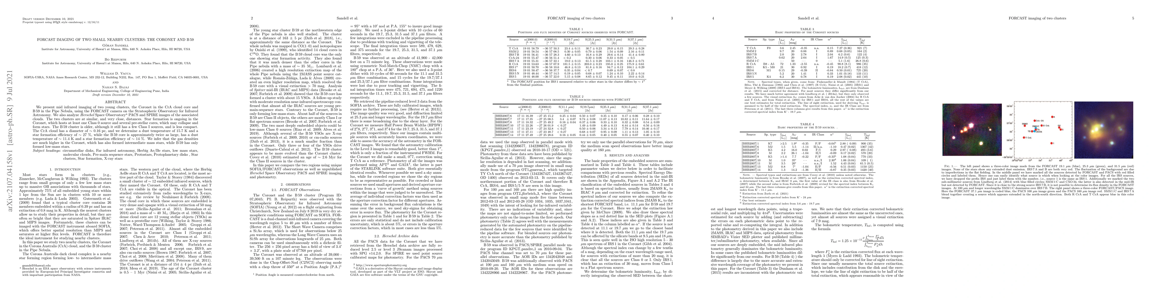 We present mid infrared imaging of two young clusters, the Coronet in the CrA cloud core and B59 in the Pipe Nebula, using the FORCAST camera on the Stratospheric Observatory for Infrared Astronomy. We also analyze Herschel Space Observatory PACS and SPIRE images of the associated clouds. The two clusters are at similar, and very close, distances. Star formation is ongoing in the Coronet, which hosts at least one Class 0 source and several pre-stellar cores, which may collapse and form stars. The B59 cluster is older, although it still has a few Class I sources, and is less compact. The CrA cloud has a diameter of about 0.16 pc, and we determine a dust temperature of 15.7 K and a star formation efficiency of about 27 %, while the B59 core is approximately twice as large, has a dust temperature of about 11.4 K and a star formation efficiency of about 14 %. We infer that the gas densities are much higher in the Coronet, which has also formed intermediate mass stars, while B59 has only formed low-mass stars.