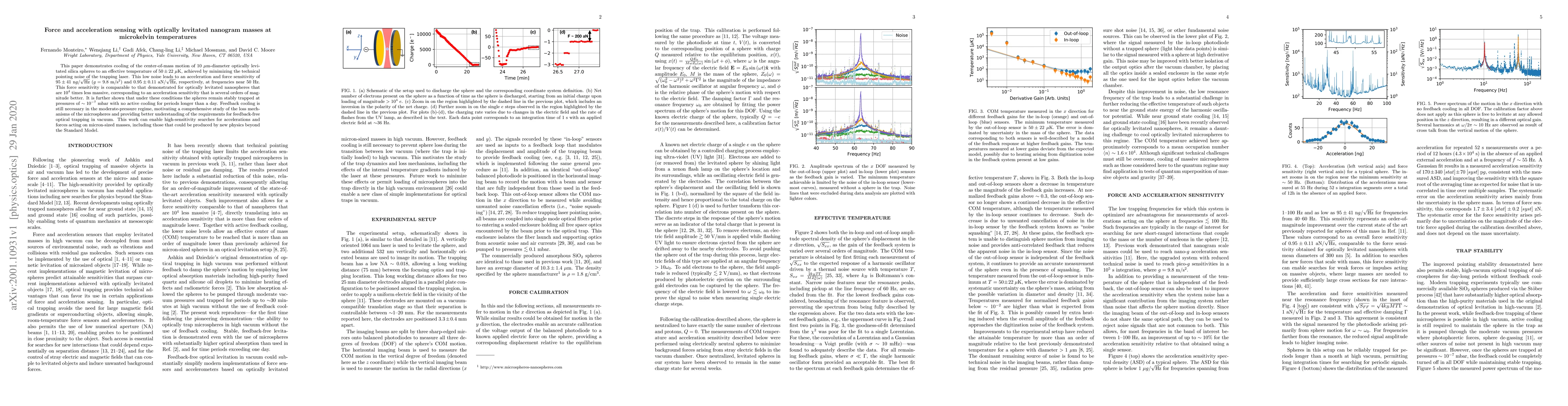 This paper reports the cooling of optically levitated silica spheres to microkelvin temperatures, achieving unprecedented force and acceleration sensitivities, and demonstrates stable trapping in vacuum without active cooling for extended periods. The study highlights potential applications in high-sensitivity searches for new physics.
