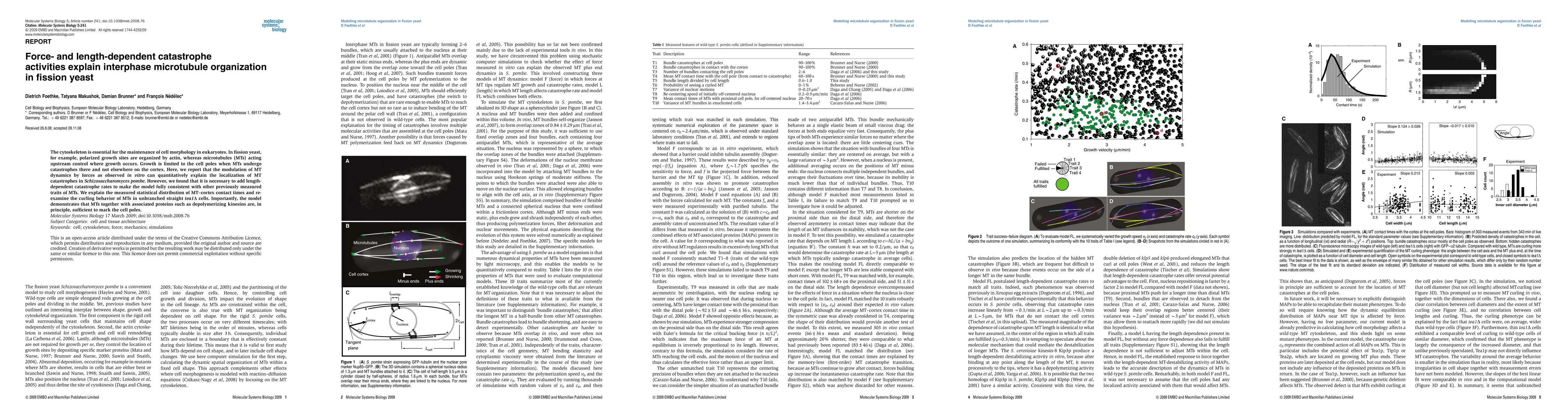 The cytoskeleton is essential for the maintenance of cell morphology in eukaryotes. In fission yeast for example, polarized growth sites are organized by actin whereas microtubules (MT) acting upstream control where growth occurs (La Carbona et al, 2006). Growth is limited to the cell poles when MTs undergo catastrophes there and not elsewhere on the cortex (Brunner and Nurse, 2000). Here we report that the modulation of MT dynamics by forces as observed in vitro (Dogterom and Yurke, 1997; Janson et al, 2003) can quantitatively explain the localization of MT catastro-phes in S. pombe. However, we found that it is necessary to add length-dependent catastrophe rates to make the model fully consistent with other measured traits of MTs. This result demonstrates the possibility that MTs together with associated proteins such as kinesins having a depolymerization activity can reliably mark the tips of the cell.