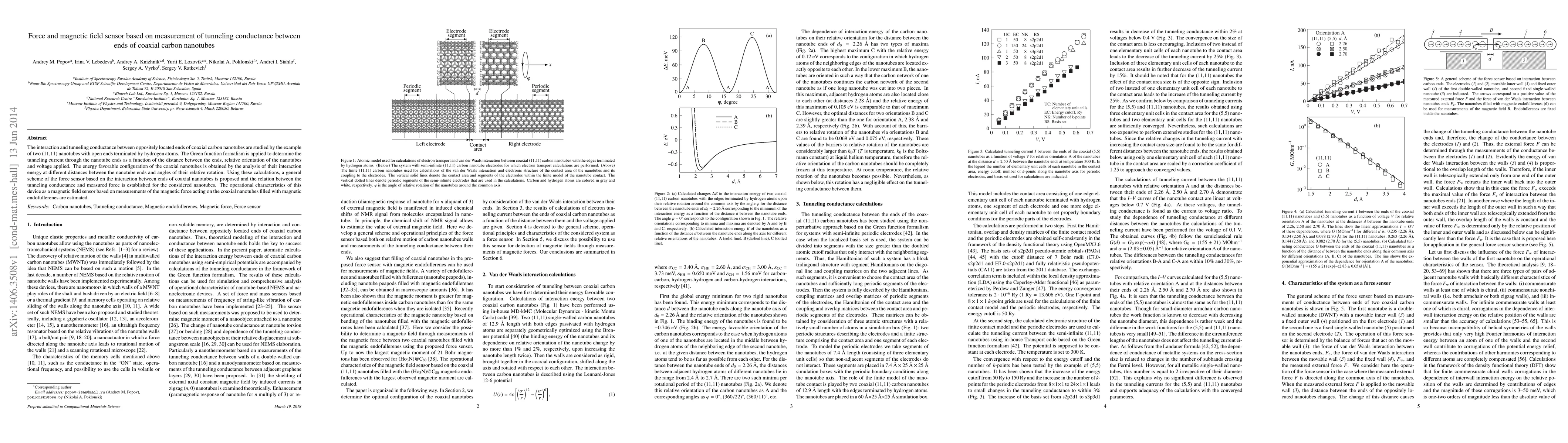 The interaction and tunneling conductance between oppositely located ends of coaxial carbon nanotubes are studied by the example of two (11,11) nanotubes with open ends terminated by hydrogen atoms. The Green function formalism is applied to determine the tunneling current through the nanotube ends as a function of the distance between the ends, relative orientation of the nanotubes and voltage applied. The energy favorable configuration of the coaxial nanotubes is obtained by the analysis of their interaction energy at different distances between the nanotube ends and angles of their relative rotation. Using these calculations, a general scheme of the force sensor based on the interaction between ends of coaxial nanotubes is proposed and the relation between the tunneling conductance and measured force is established for the considered nanotubes. The operational characteristics of this device as a magnetic field sensor based on measurements of the magnetic force acting on the coaxial nanotubes filled with magnetic endofullerenes are estimated.