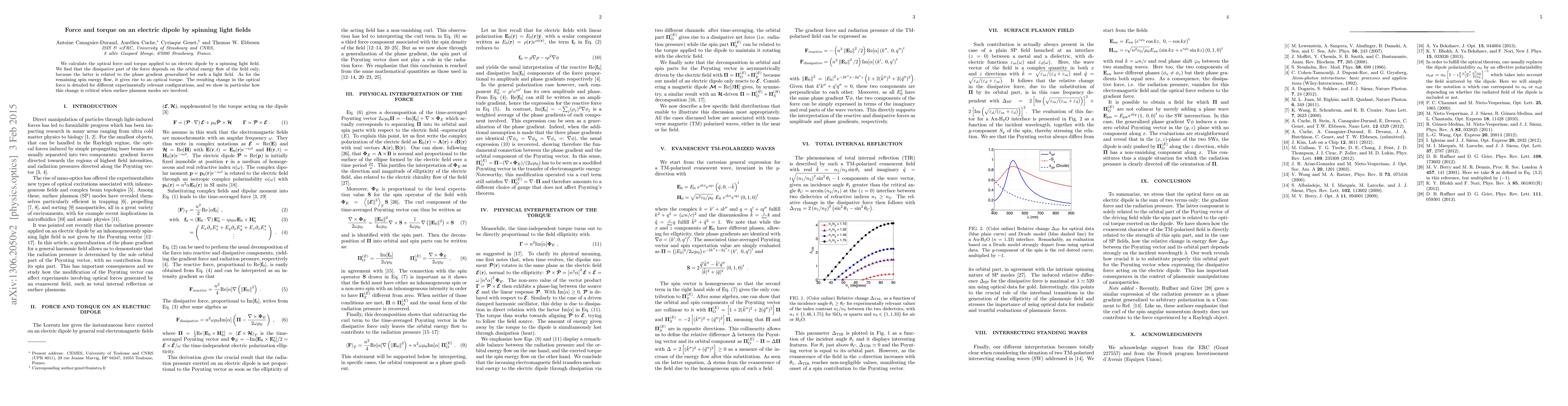 This paper calculates the optical force and torque on an electric dipole due to spinning light fields, revealing that the force depends on the orbital energy flow, while the torque arises from the spin energy flow. The study highlights the significance of these effects in configurations involving surface plasmon modes.