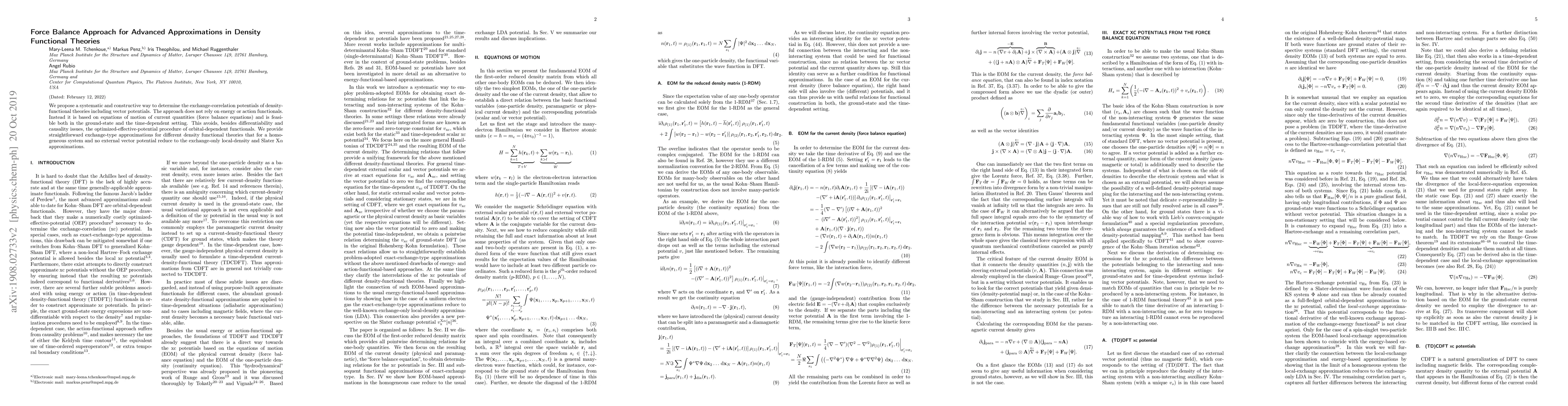 This paper introduces a novel force balance approach to determine exchange-correlation potentials in density functional theories, avoiding reliance on energy or action functionals. It provides straightforward exchange-type approximations that reduce to established methods for homogeneous systems without external vector potentials.