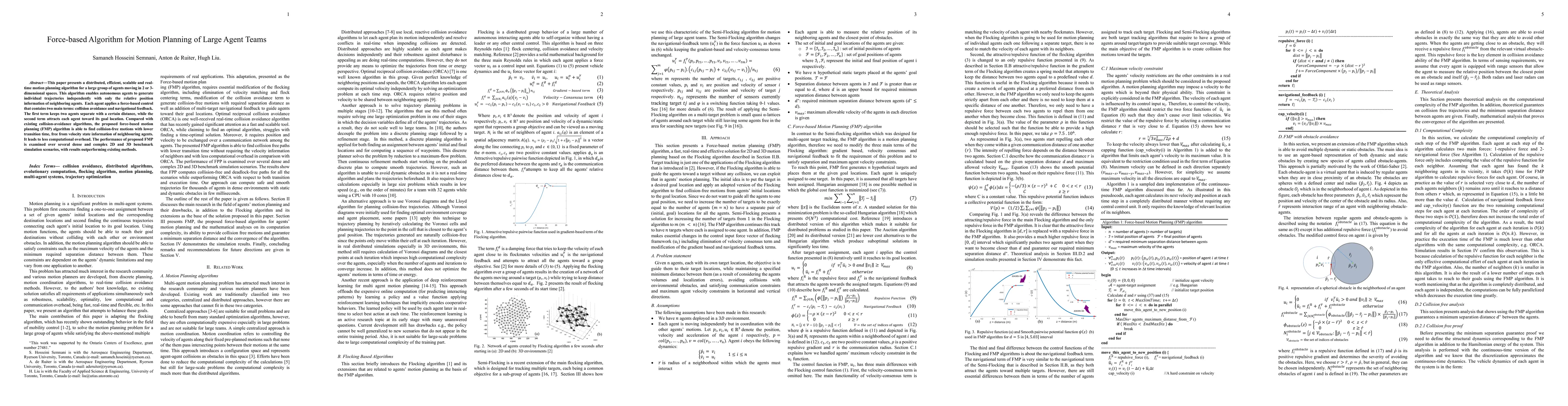 This paper presents a distributed, efficient, scalable and real-time motion planning algorithm for a large group of agents moving in 2 or 3-dimensional spaces. This algorithm enables autonomous agents to generate individual trajectories independently with only the relative position information of neighboring agents. Each agent applies a force-based control that contains two main terms: collision avoidance and navigational feedback. The first term keeps two agents separate with a certain distance, while the second term attracts each agent toward its goal location. Compared with existing collision-avoidance algorithms, the proposed force-based motion planning (FMP) algorithm is able to find collision-free motions with lower transition time, free from velocity state information of neighbouring agents. It leads to less computational overhead. The performance of proposed FMP is examined over several dense and complex 2D and 3D benchmark simulation scenarios, with results outperforming existing methods.