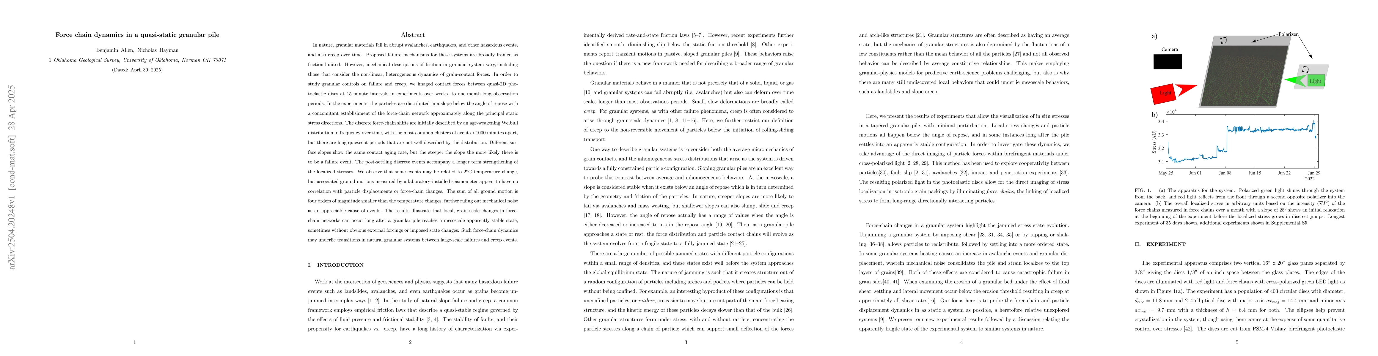 The study utilized quasi-2D photoelastic discs in a slope configuration below the angle of repose, allowing for the imaging of contact forces at 15-minute intervals over weeks to a month. This enabled the observation of force-chain network formation and discrete shifts.