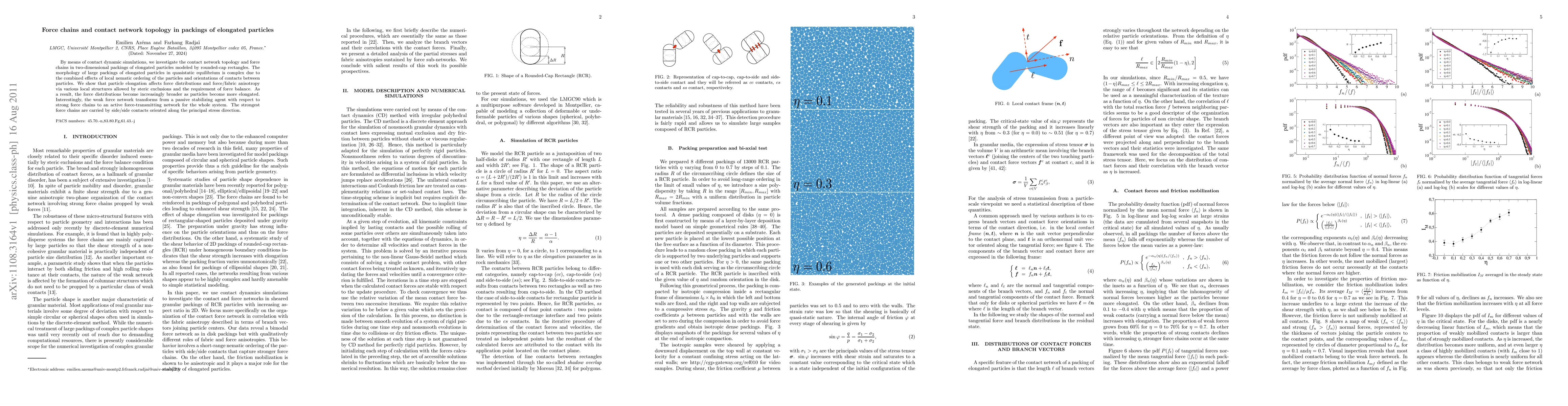 Research on elongated particles in 2D packings reveals that particle shape affects force distribution and network topology, transforming from passive to active force-transmitting networks as particles become more elongated.