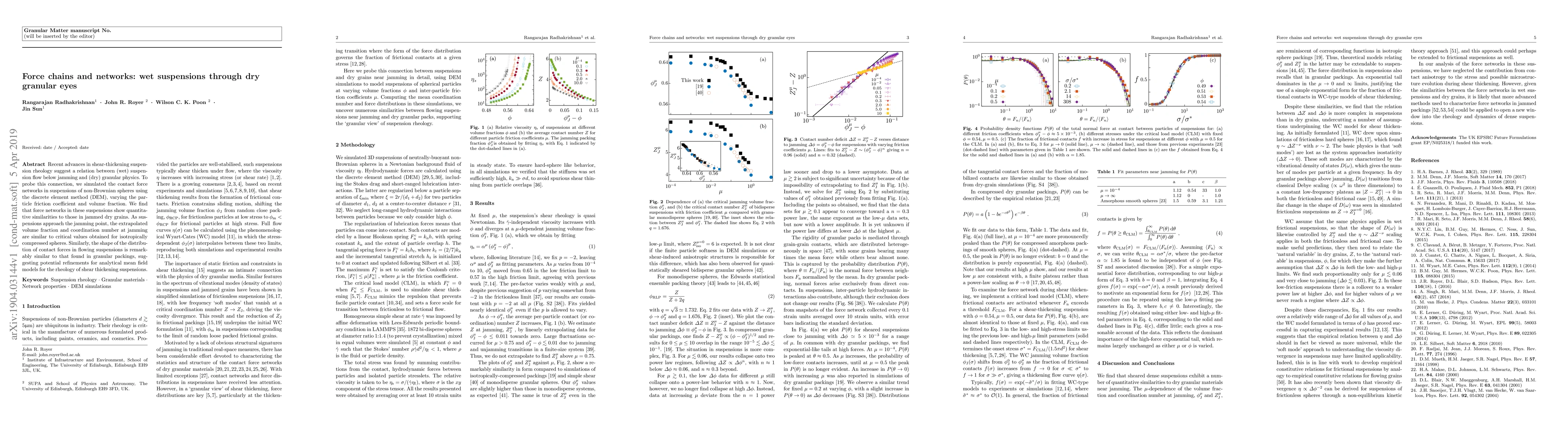 This paper investigates the similarities between force networks in wet suspensions and dry granular materials using discrete element method simulations. The study finds that as suspensions approach jamming, their force networks and critical values resemble those in jammed dry granular systems, suggesting potential improvements for models of shear thickening suspension rheology.