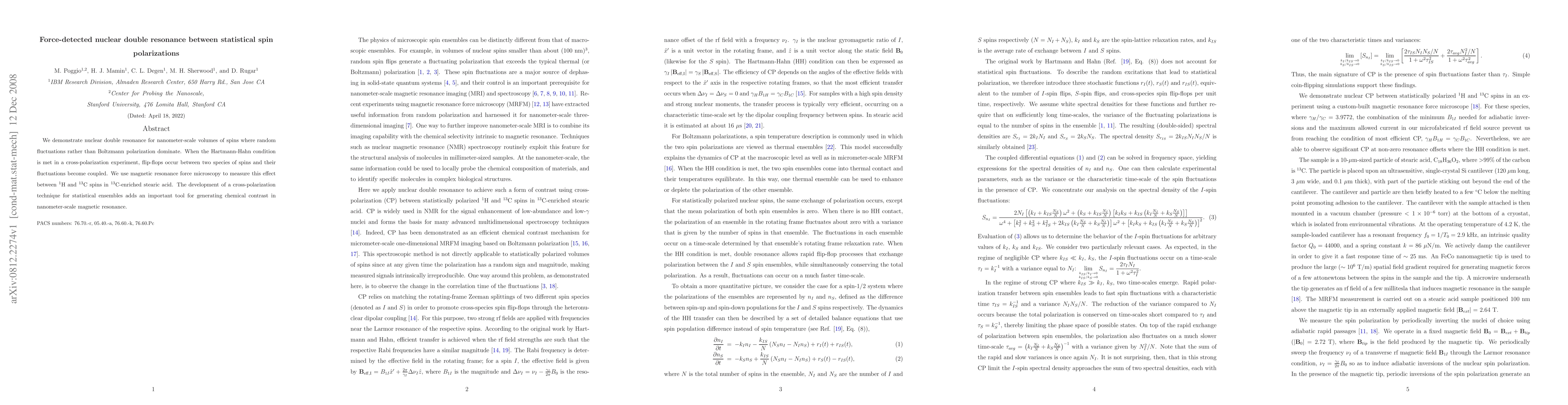 We demonstrate nuclear double resonance for nanometer-scale volumes of spins where random fluctuations rather than Boltzmann polarization dominate. When the Hartmann-Hahn condition is met in a cross-polarization experiment, flip-flops occur between two species of spins and their fluctuations become coupled. We use magnetic resonance force microscopy to measure this effect between 1H and 13C spins in 13C-enriched stearic acid. The development of a cross-polarization technique for statistical ensembles adds an important tool for generating chemical contrast in nanometer-scale magnetic resonance.