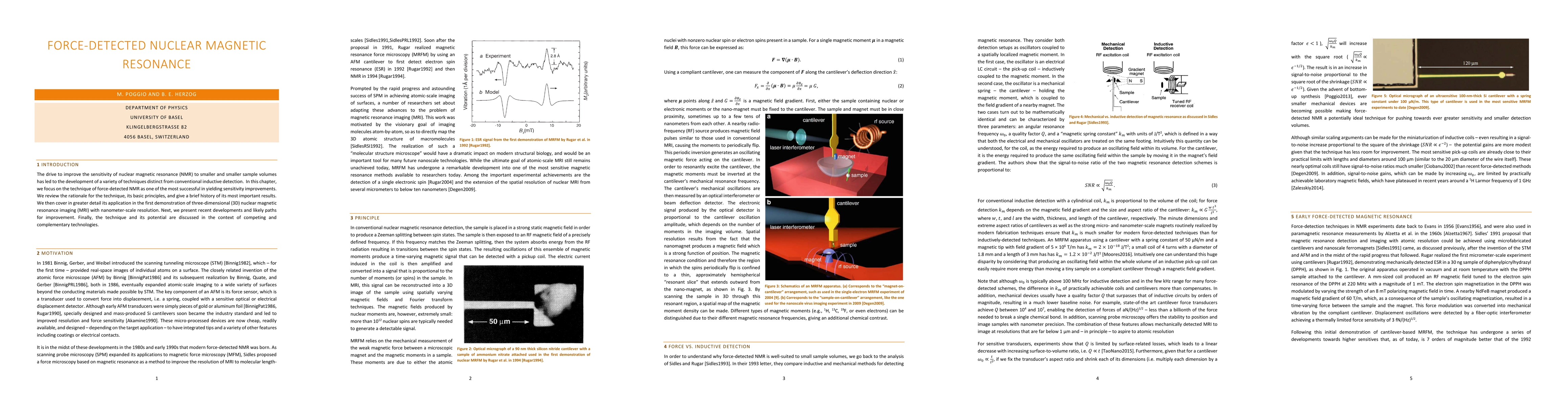The drive to improve the sensitivity of nuclear magnetic resonance (NMR) to smaller and smaller sample volumes has led to the development of a variety of techniques distinct from conventional inductive detection. In this chapter, we focus on the technique of force-detected NMR as one of the most successful in yielding sensitivity improvements. We review the rationale for the technique, its basic principles, and give a brief history of its most important results. We then cover in greater detail its application in the first demonstration of three-dimensional (3D) nuclear magnetic resonance imaging (MRI) with nanometer-scale resolution. Next we present recent developments and likely paths for improvement. Finally, the technique and its potential are discussed in the context of competing and complementary technologies.